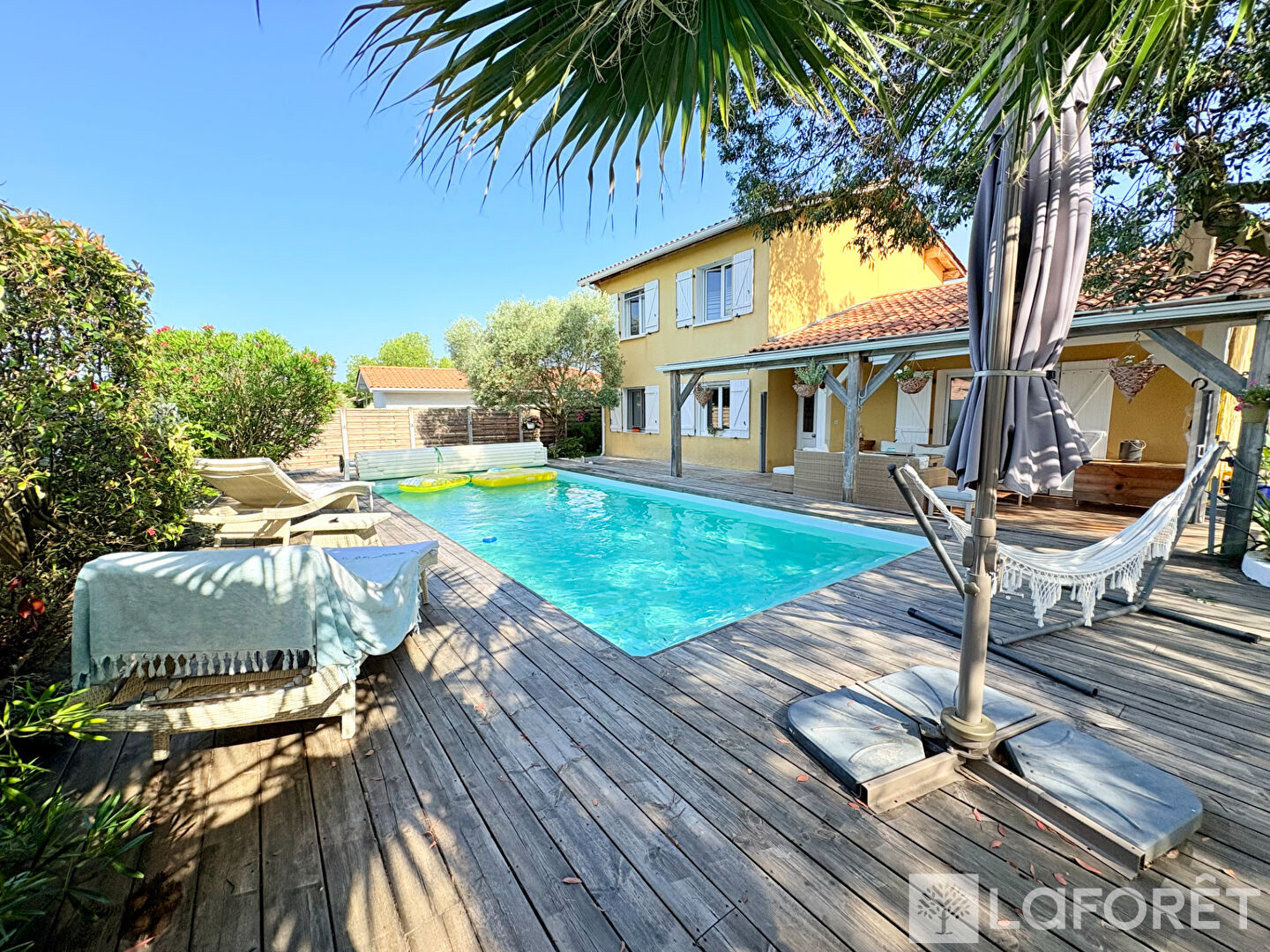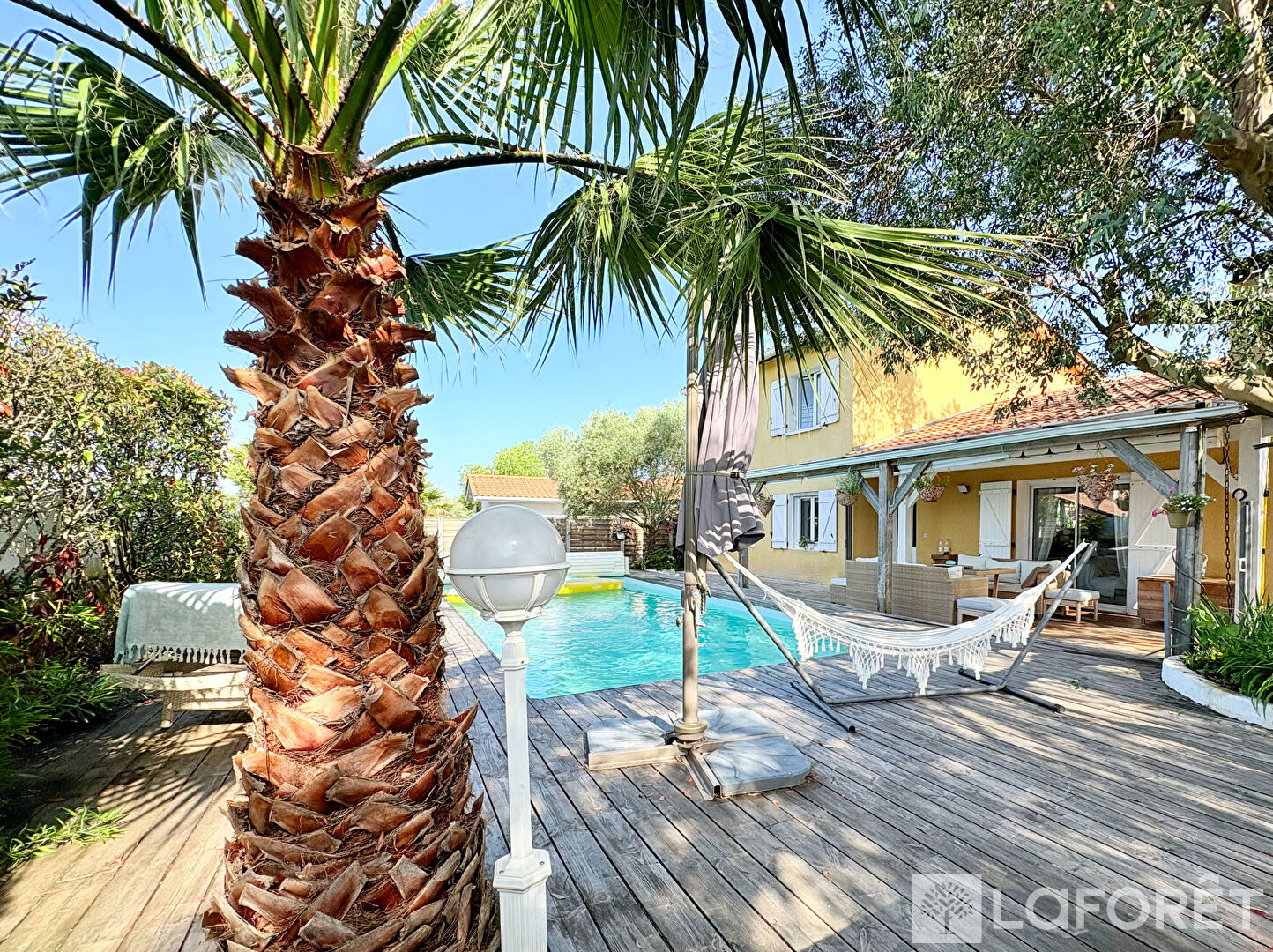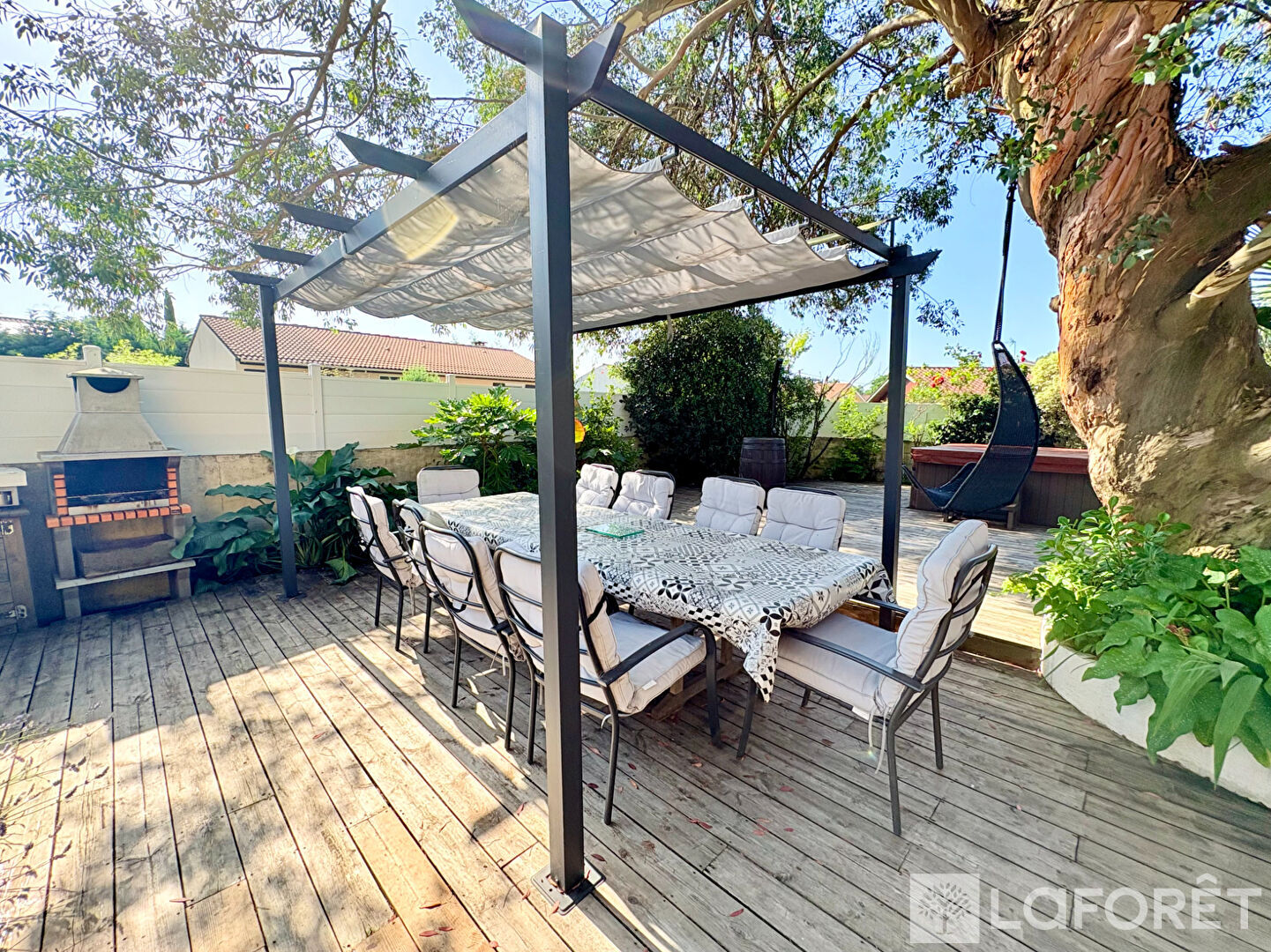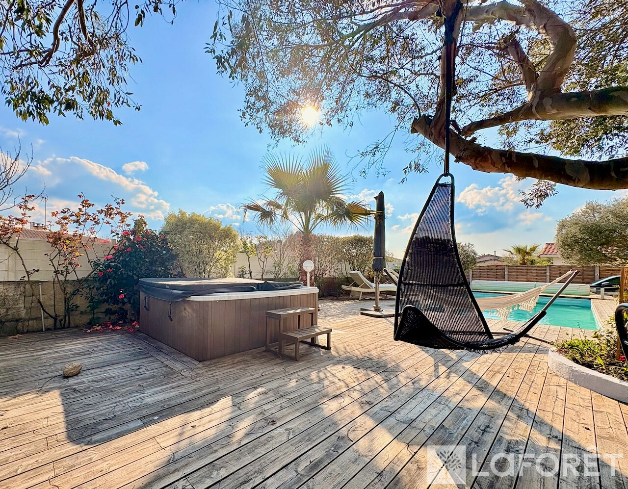 A l'extérieur vous profiterez de ses différents espaces pour vous détendre en famille ou entre amis à l'abris des regards, autour de la piscine l'été, et du spa à toute les saisons.
