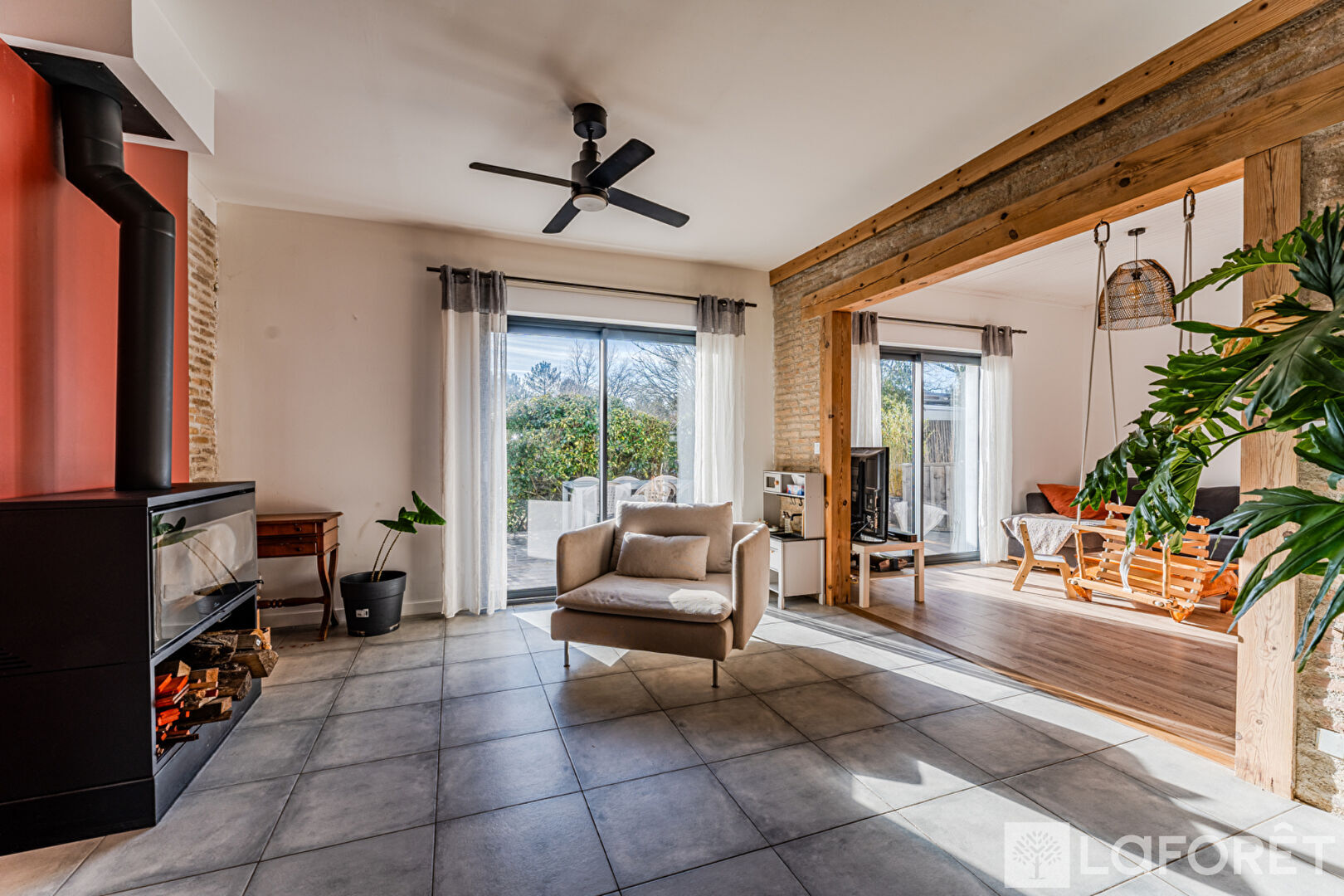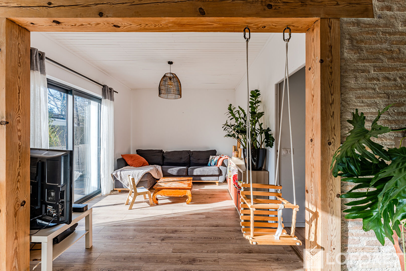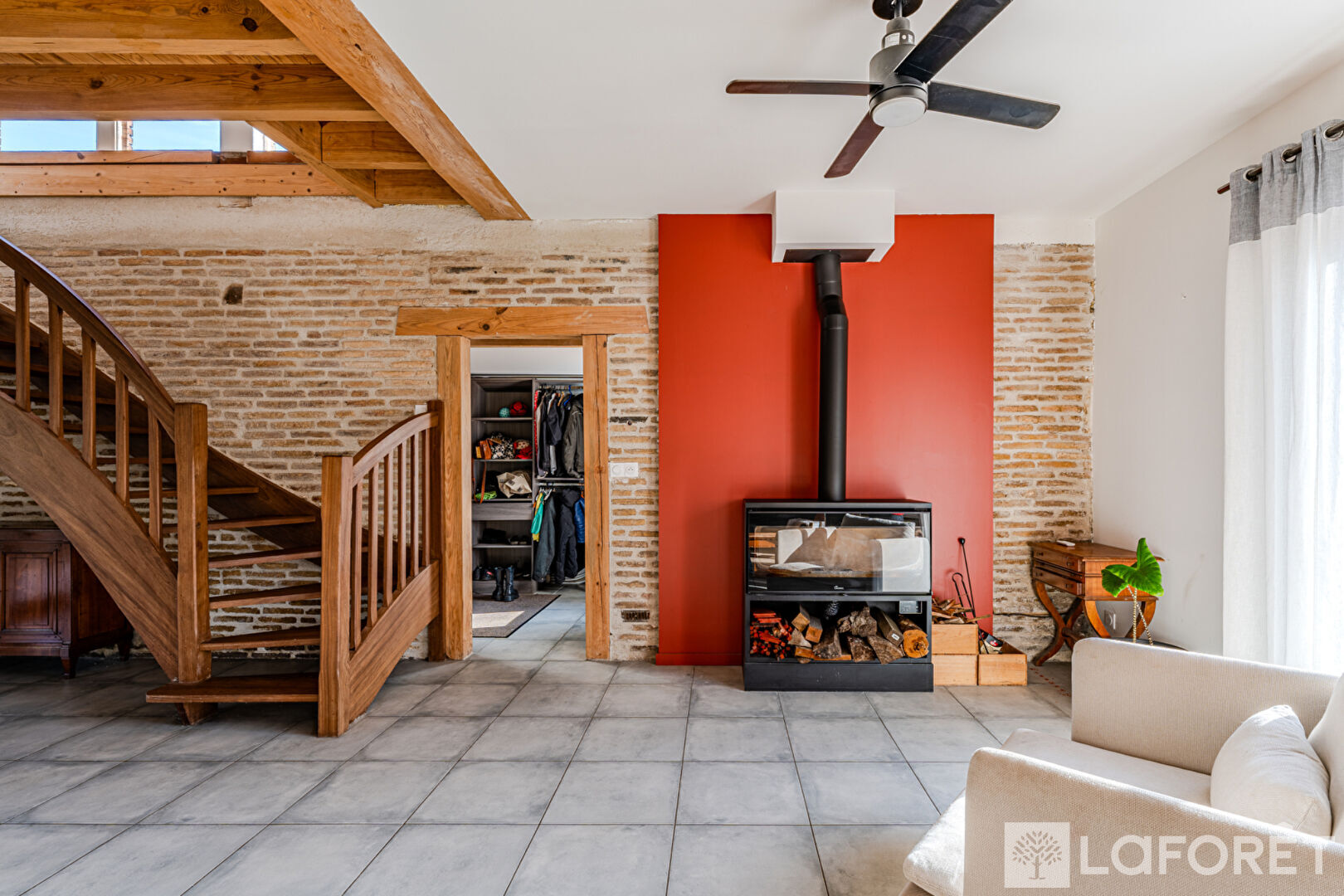 Dès l'entrée, le ton est donné. Une véritable entrée avec rangements, des WC indépendants, puis un superbe séjour salle à manger baigné de lumière. Les volumes sont généreux, les matériaux chaleureux : briques apparentes, poutres bois, hauteur sous plafond, escalier sur mesure. L'ensemble dégage un charme authentique et une atmosphère conviviale.