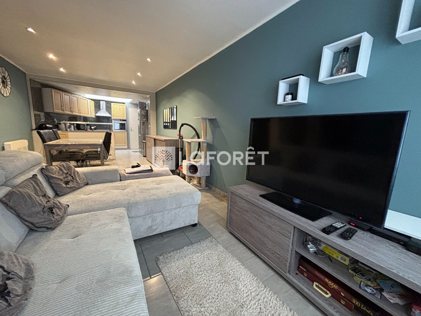 une belle pièce de vie traversante (beau carrelage) avec son agréable espace salon cocooning, une salle à manger donnant sur la jolie cuisine meublée et toute équipée, fonctionnelle avec son espace dînatoire.
