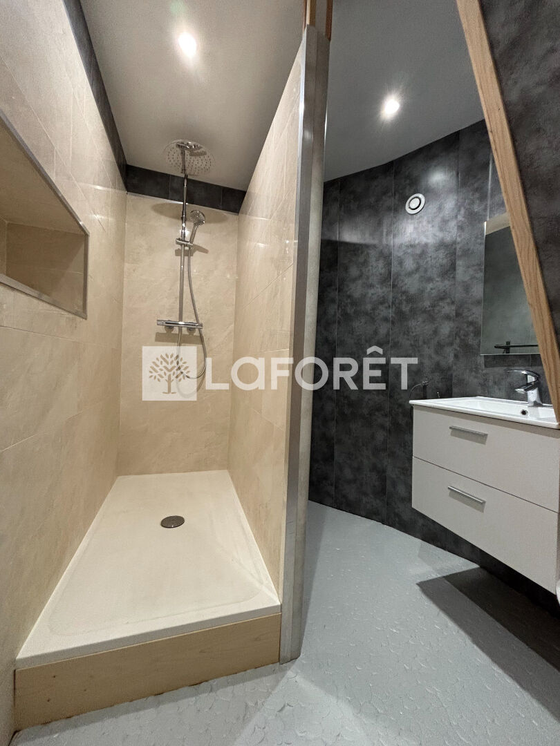 La salle d'eau totalement rénovée est dotée d'une spacieuse magnifique douche à italienne , une vasque, rangements & WC.