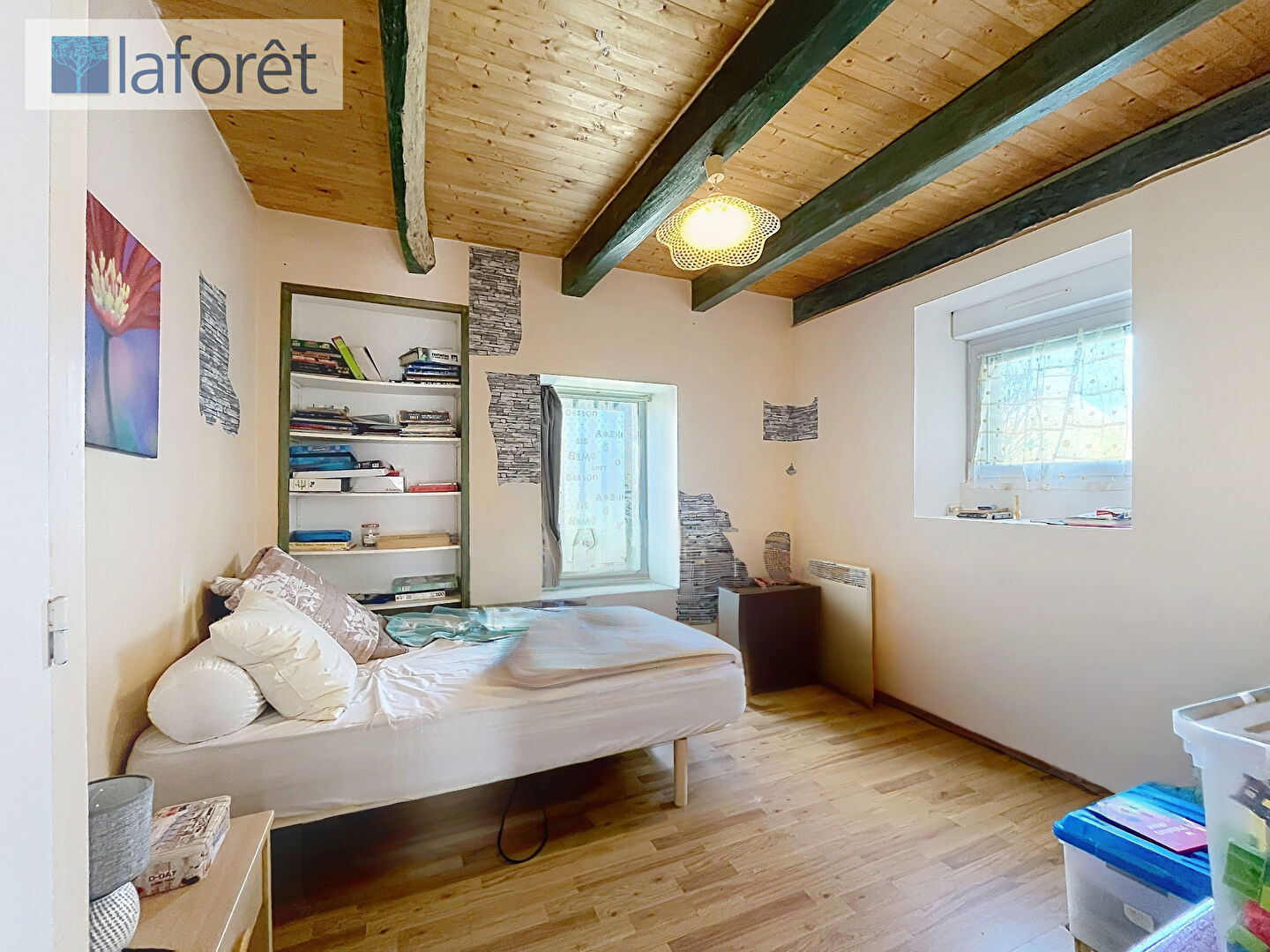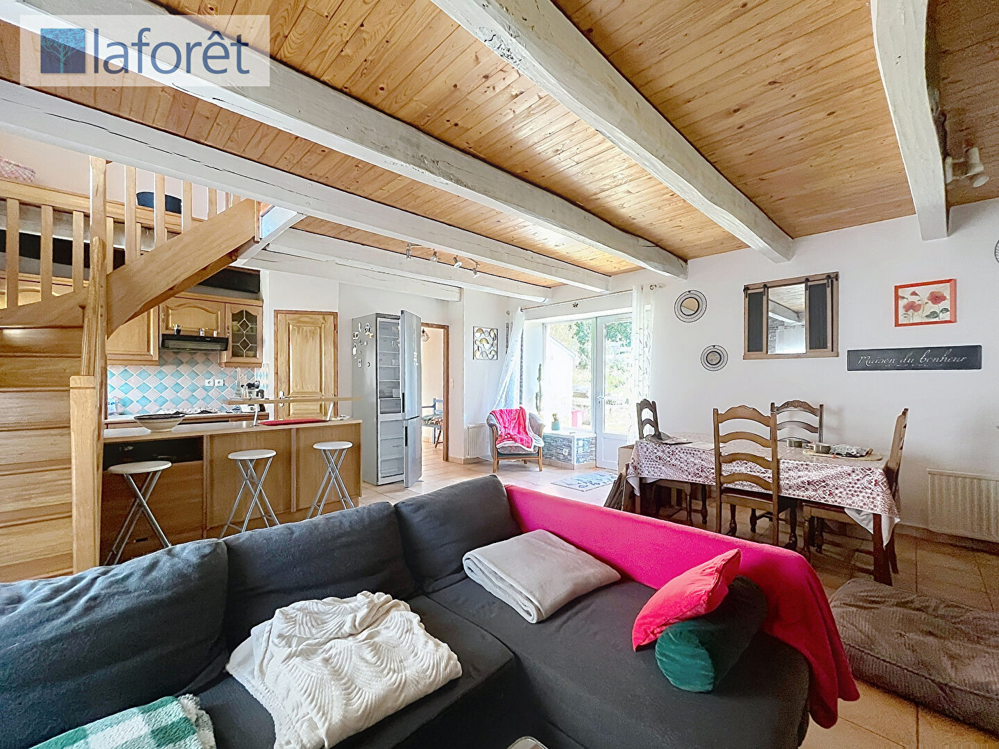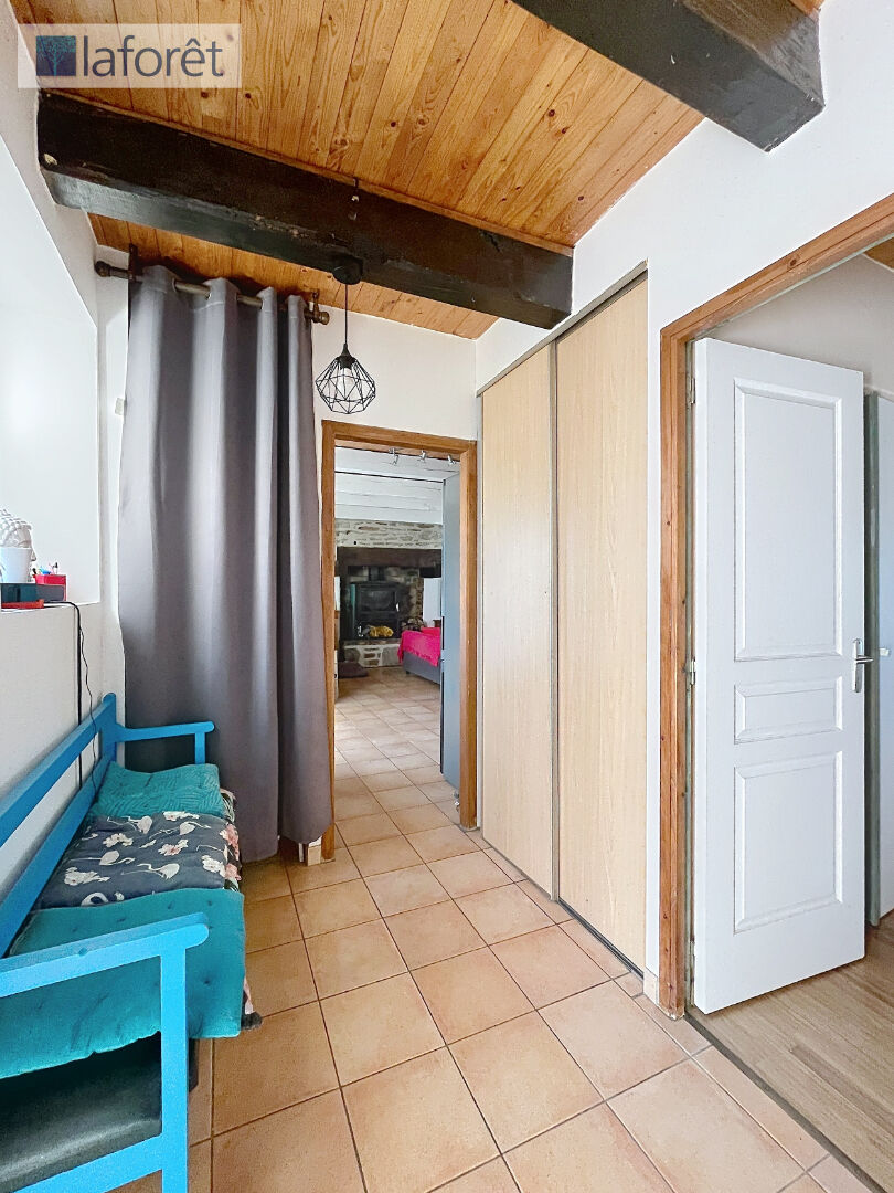 Elle se compose, au rez-de-chaussée, d'un salon-séjour chaleureux agrémenté d'un poêle à bois, d'une cuisine ouverte aménagée et équipée, de nombreux rangements, d'une chambre avec placard, d'un cellier, d'un WC indépendant ainsi que d'une salle d'eau.