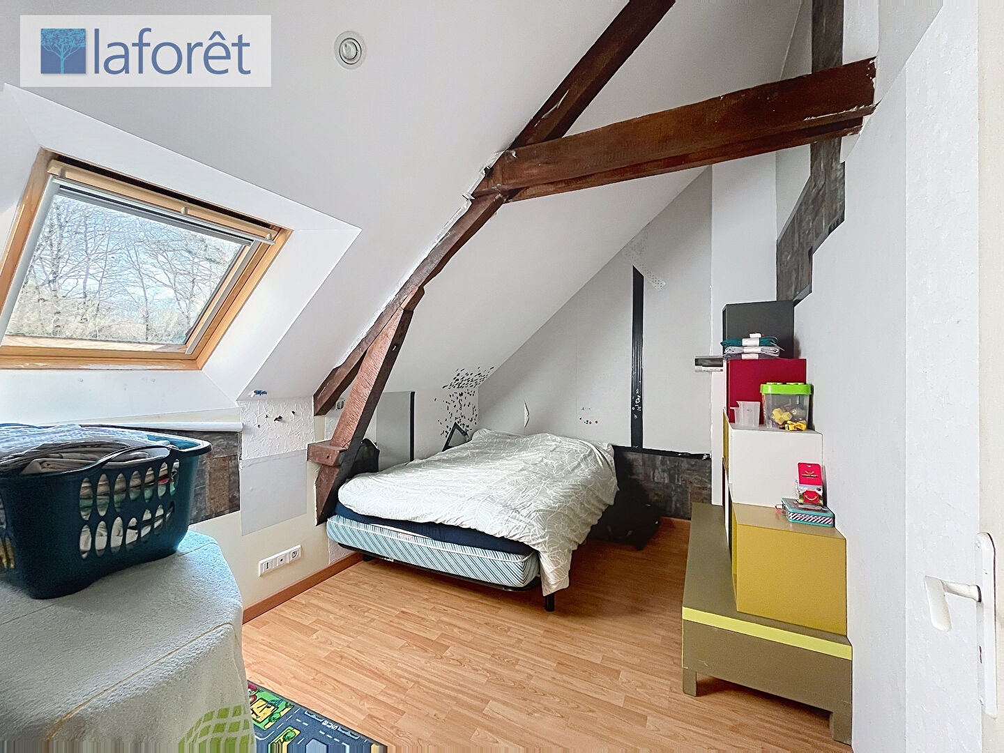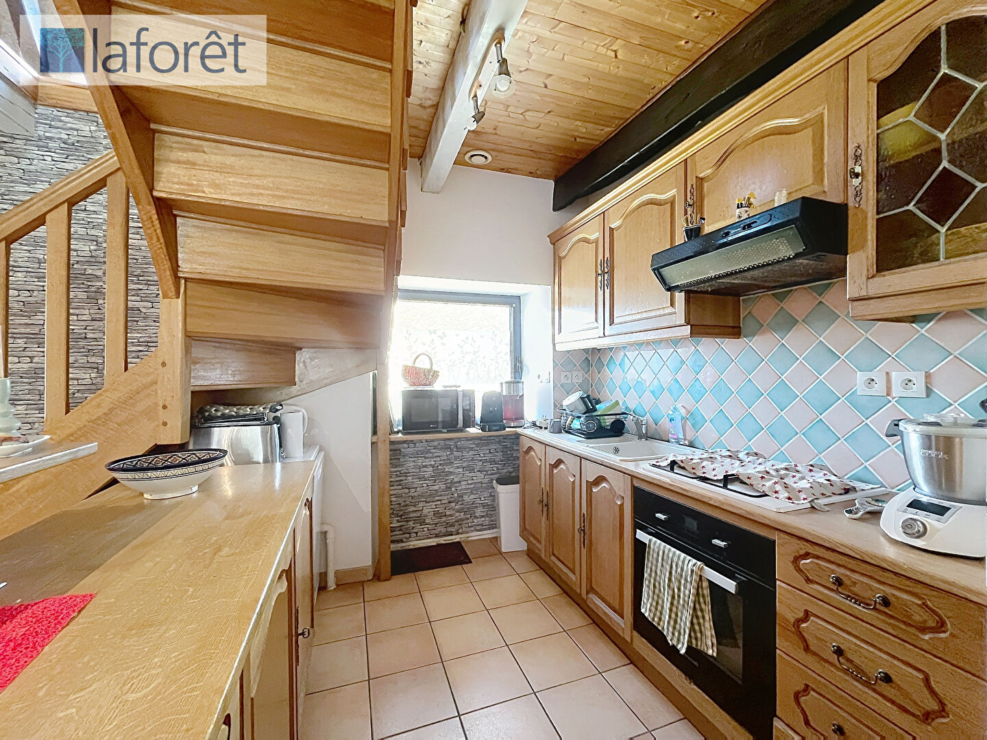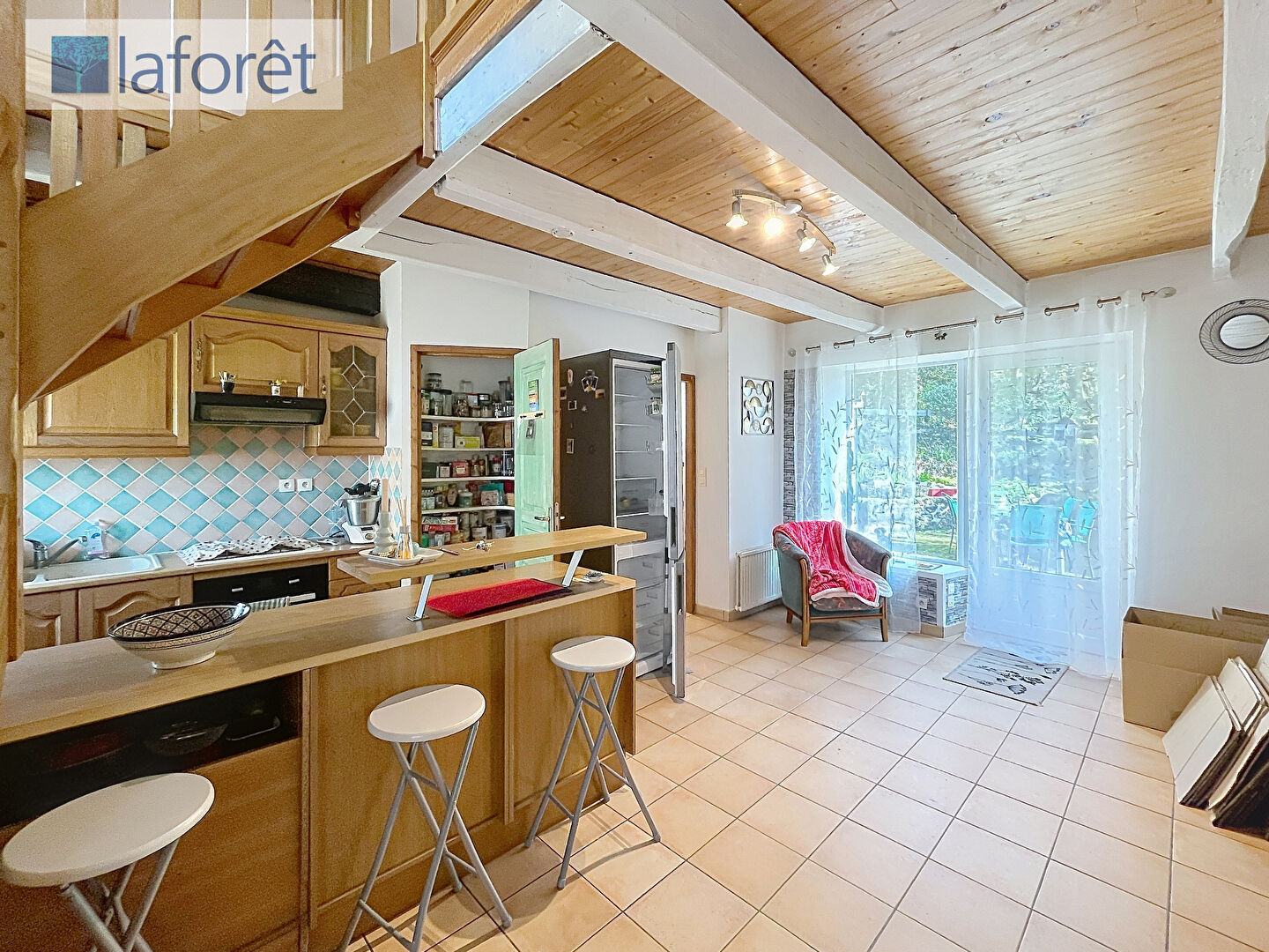 Elle se compose, au rez-de-chaussée, d'un salon-séjour chaleureux agrémenté d'un poêle à bois, d'une cuisine ouverte aménagée et équipée, de nombreux rangements, d'une chambre avec placard, d'un cellier, d'un WC indépendant ainsi que d'une salle d'eau.
