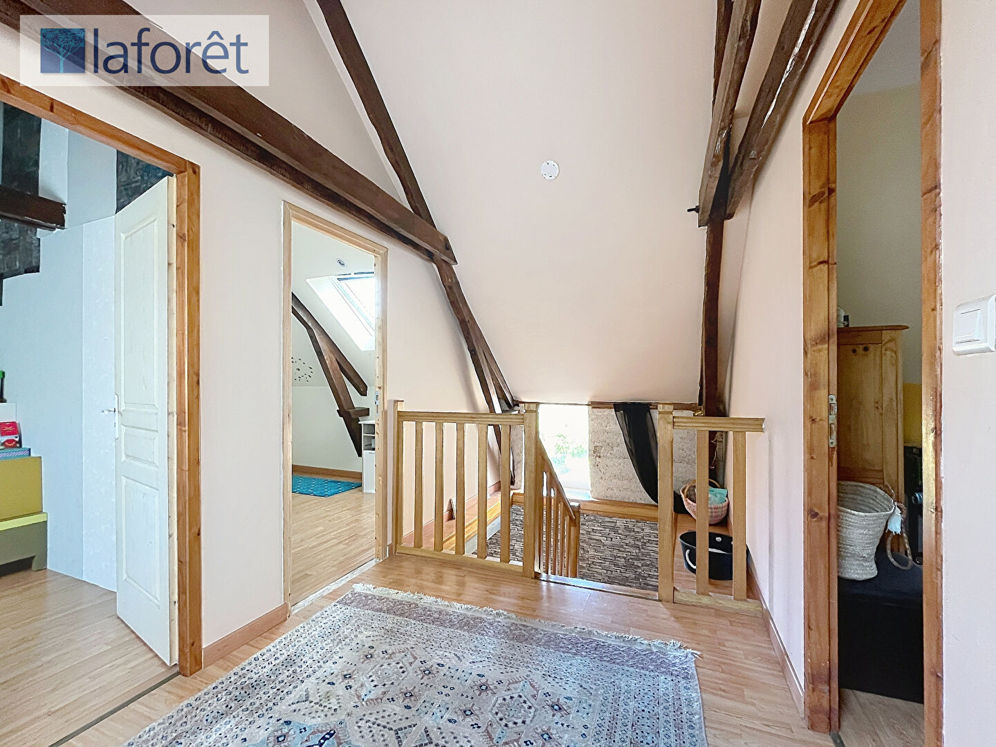L'étage dessert une mezzanine, deux chambres dont une avec espace dressing, un bureau et une salle d'eau avec WC.