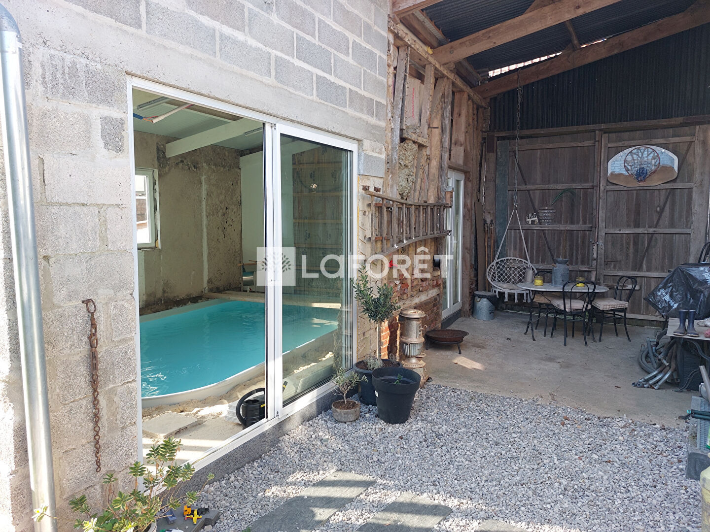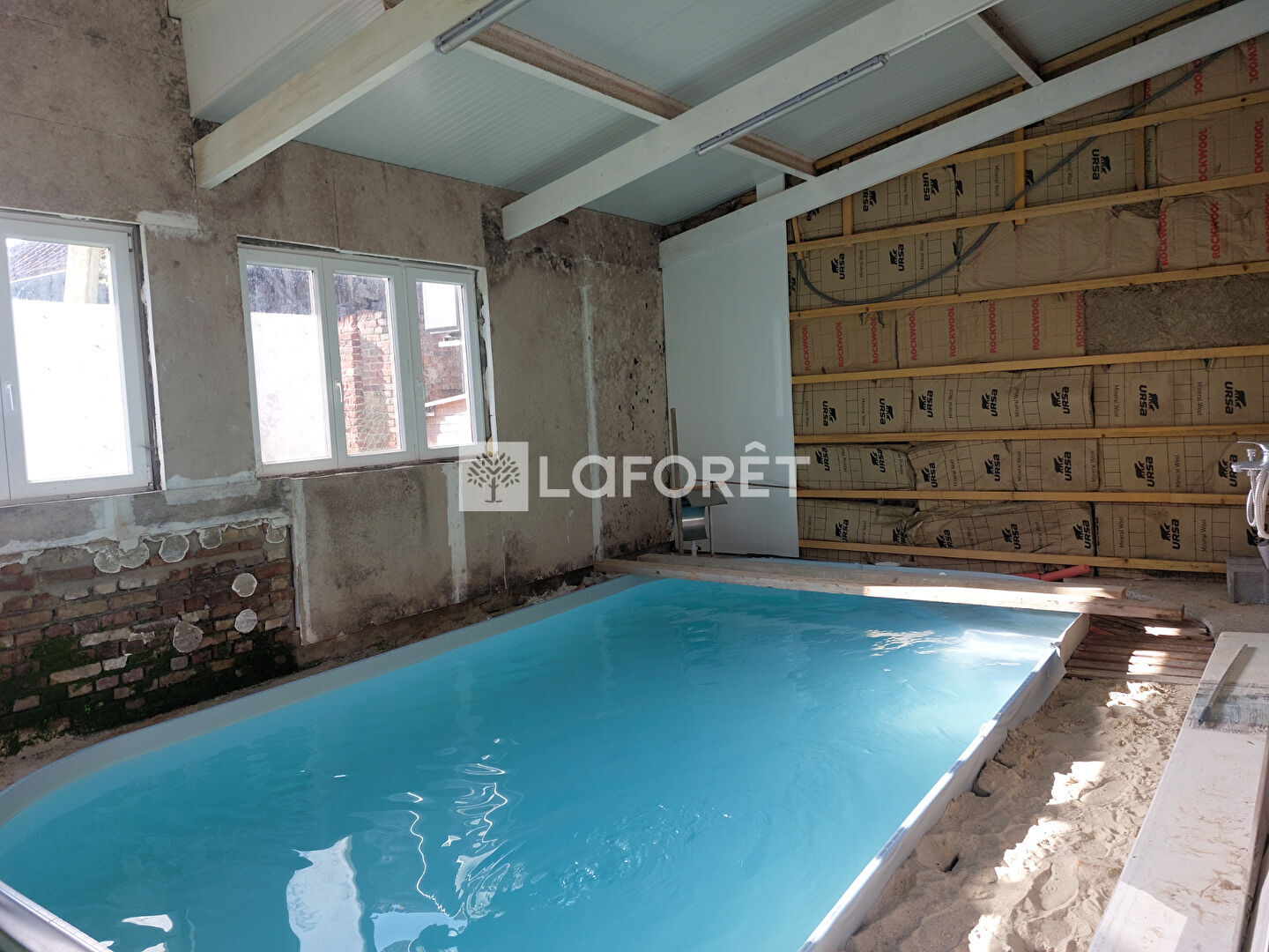 Elle dispose au rez de chaussée d'une salle, salon avec poêle à pellets, cuisine équipée, 2 chambres, buanderie, salle de bains. A l'étage 1 chambre avec salle d'eau (douche lavabo wc). Le plus de cette maison, une piscine intérieure à finir d'aménager. Dépendances et garage, le tout sur 825 m² .