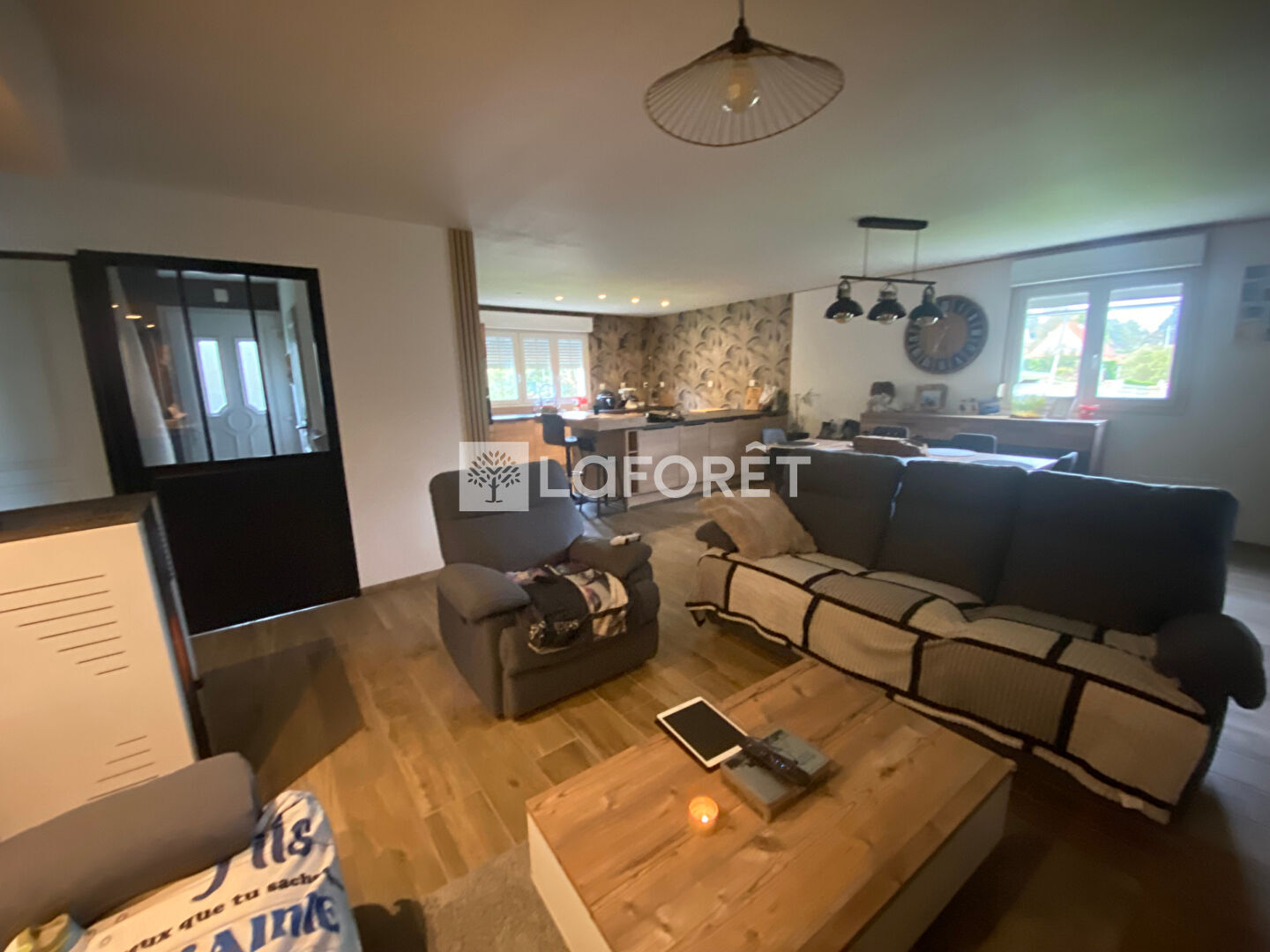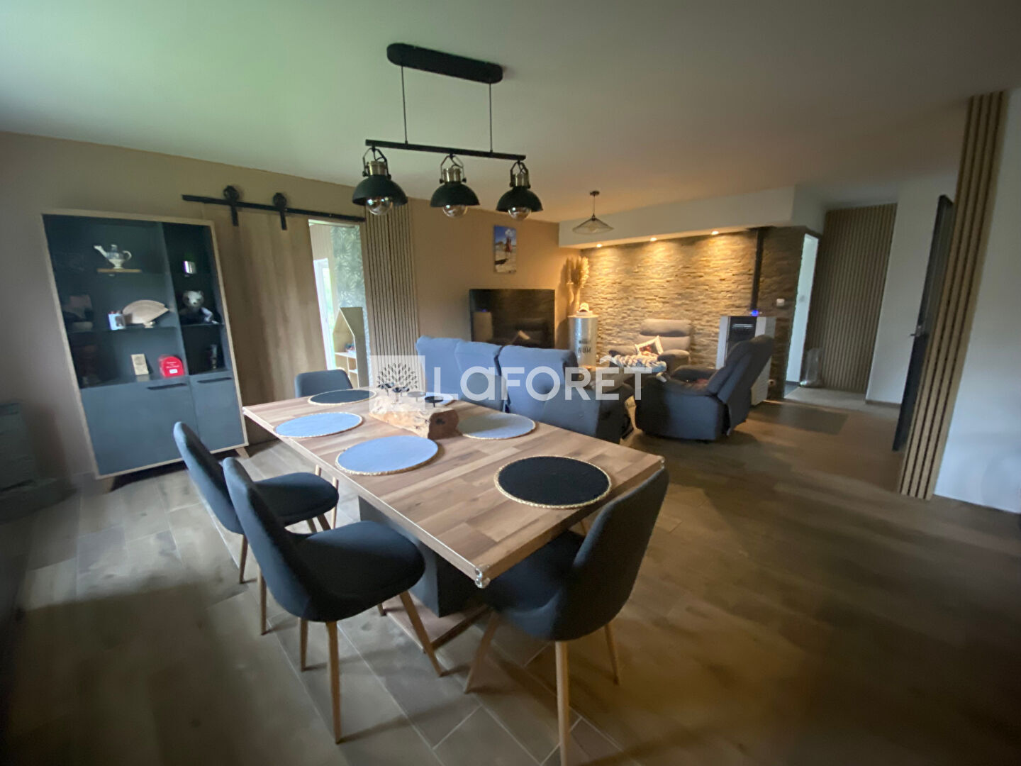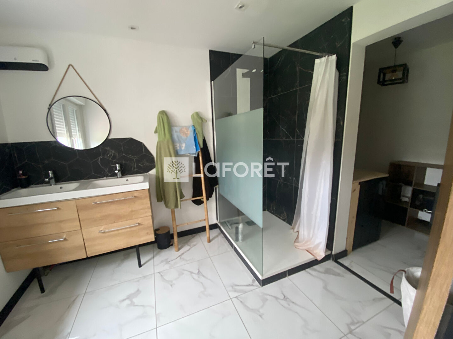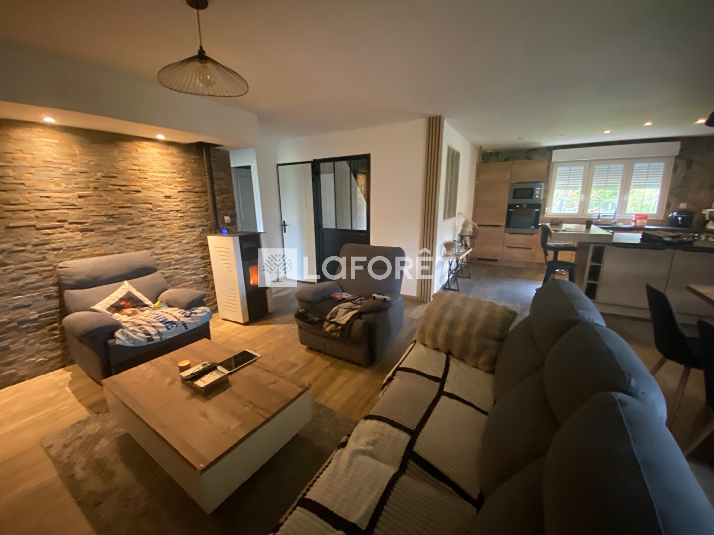 Hall d'entrée, Cuisine équipée récente ouverte sur le séjour salon avec poêle au pellet, Chambre avec salle de bains attenante, Chambre, salle de bains et lingerie WC