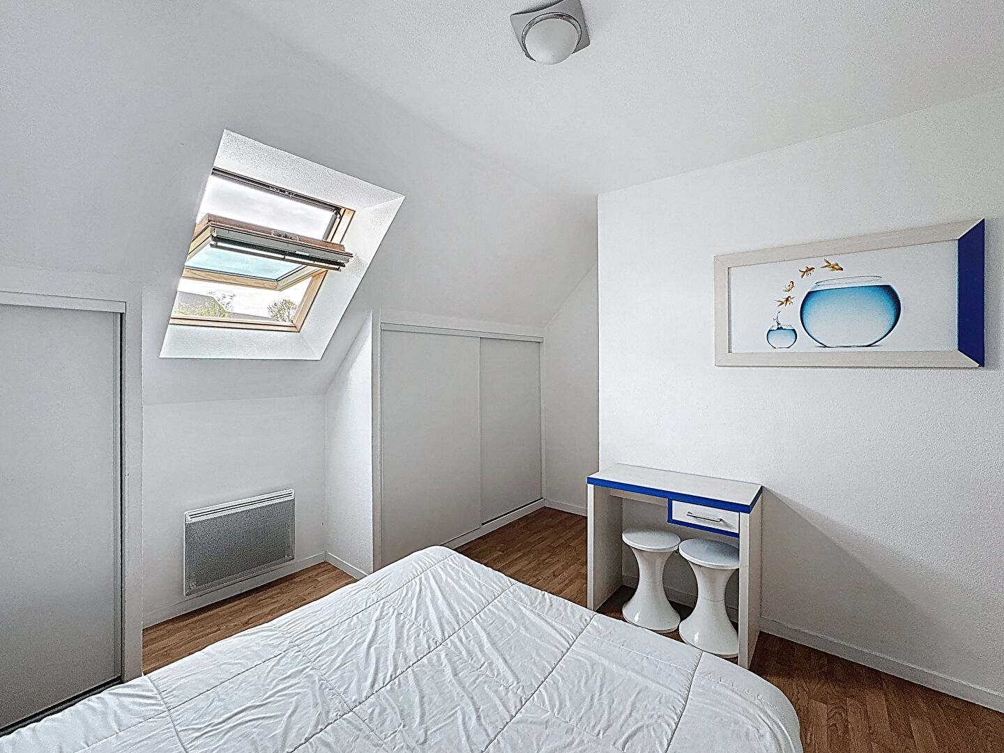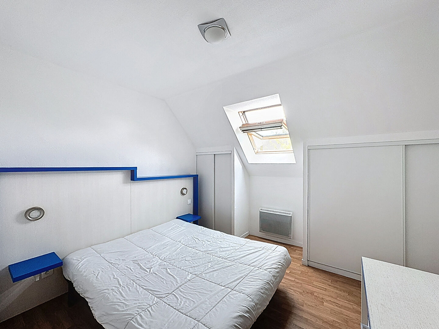 À l'étage, vous trouverez une chambre de plus de 9 m² ainsi qu'une salle de bain de 2,2 m².