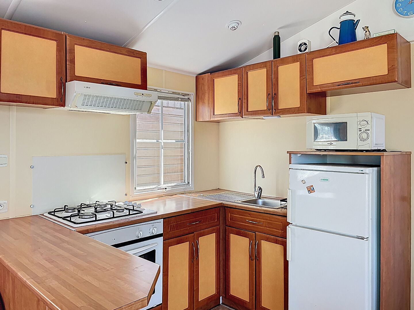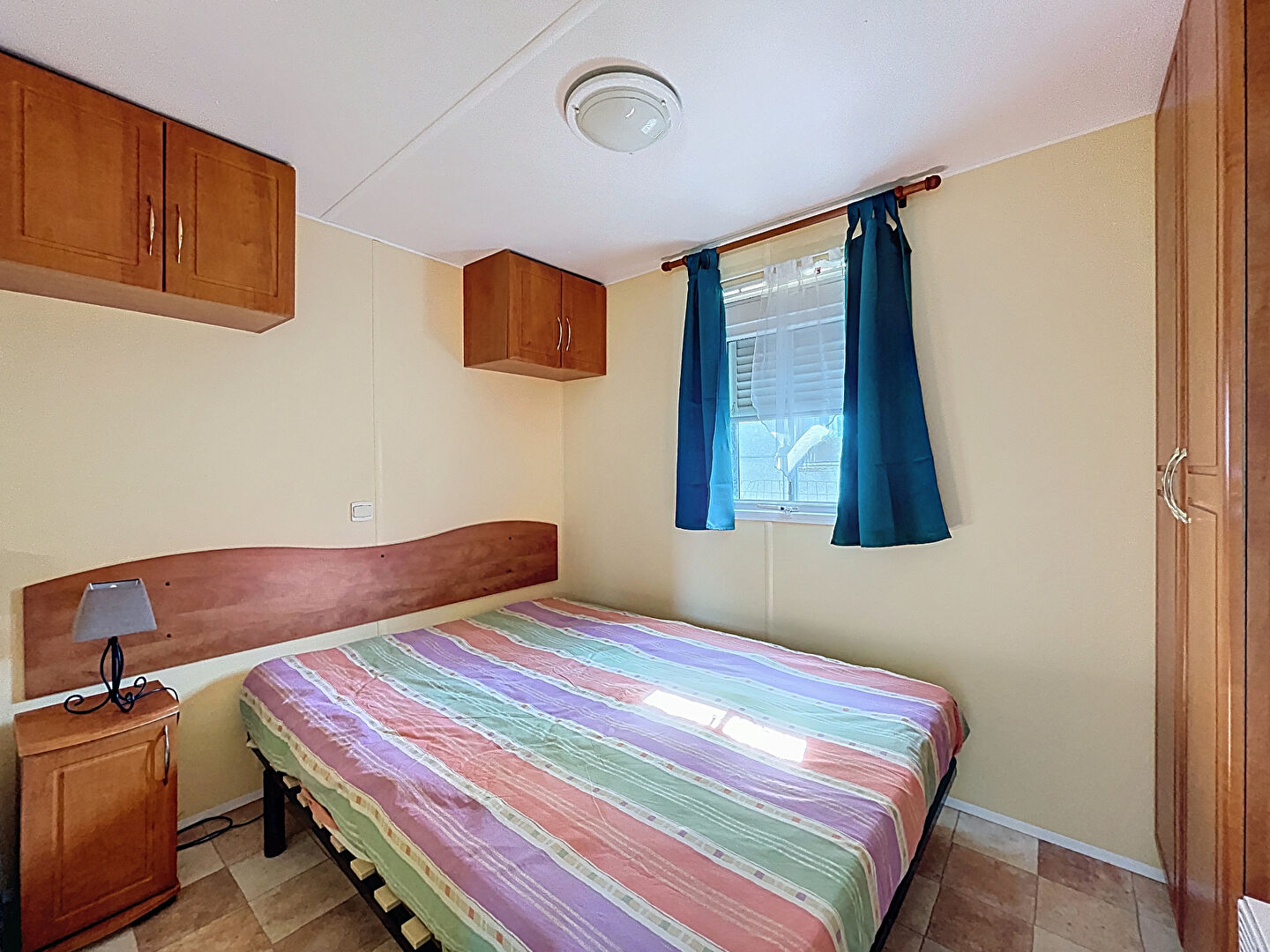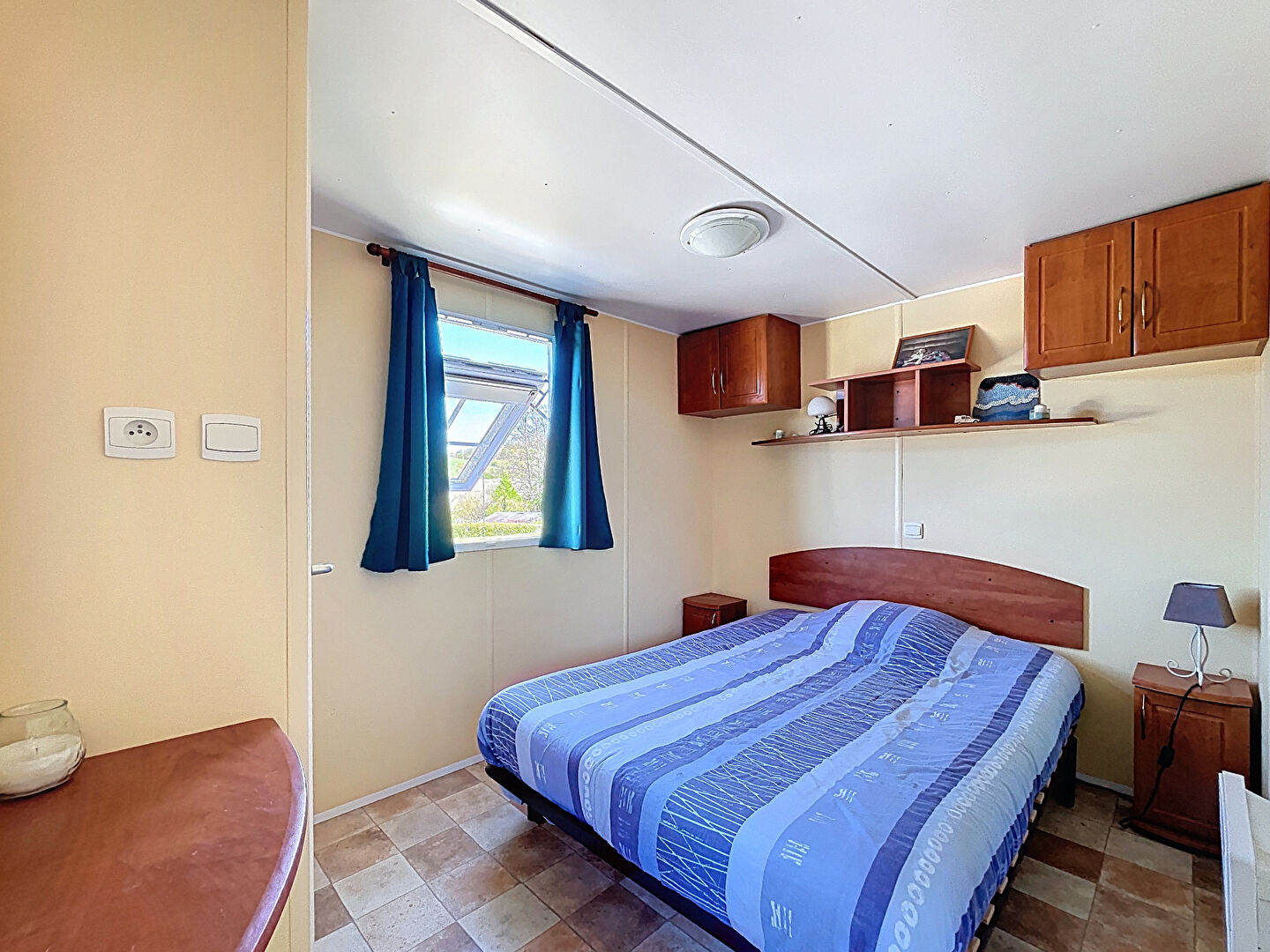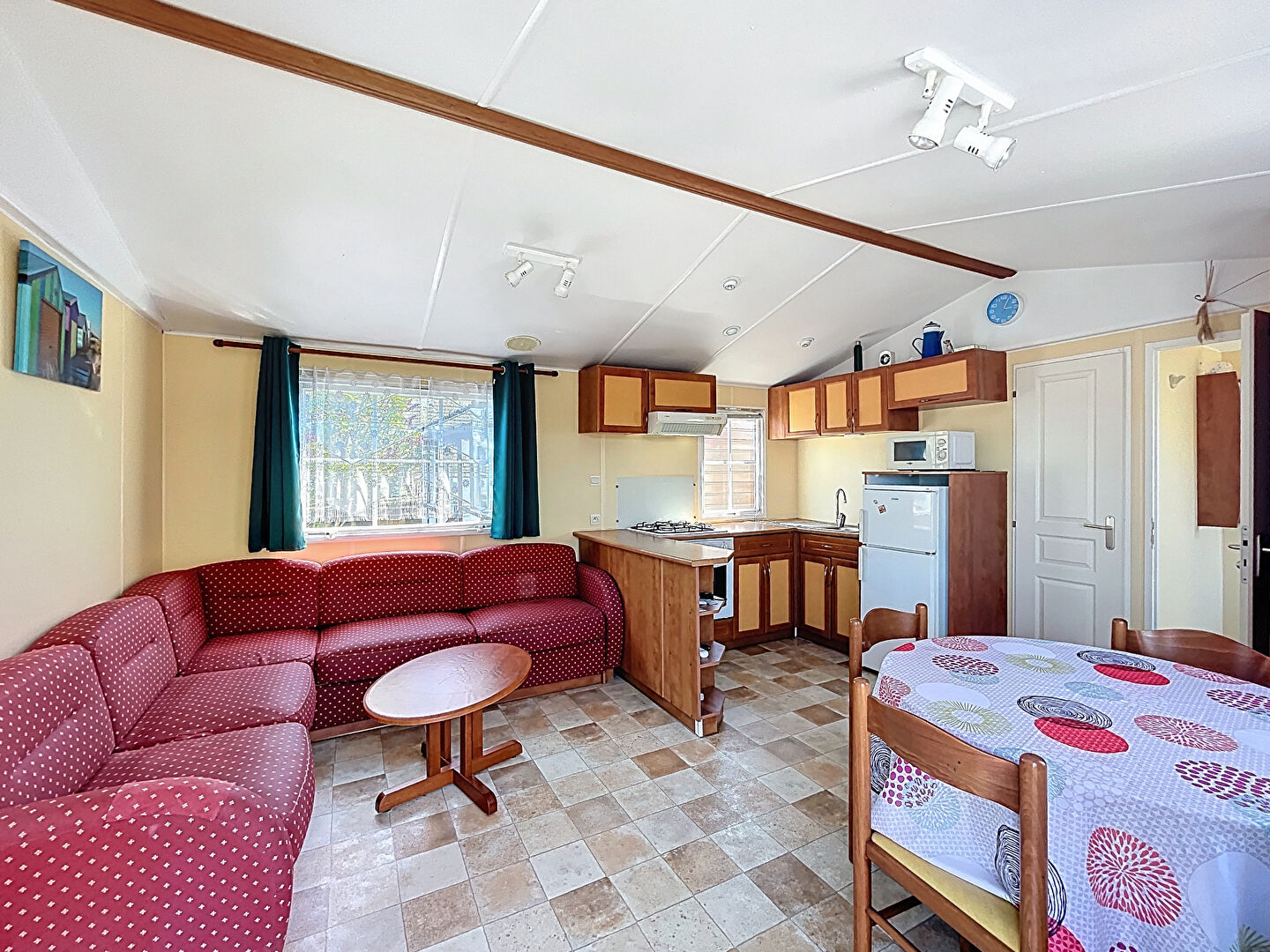 Le mobil-home, spacieux et fonctionnel, se compose d'un séjour avec cuisine ouverte de 17 m², de deux chambres avec placards, d'une salle d'eau et d'un WC indépendant.