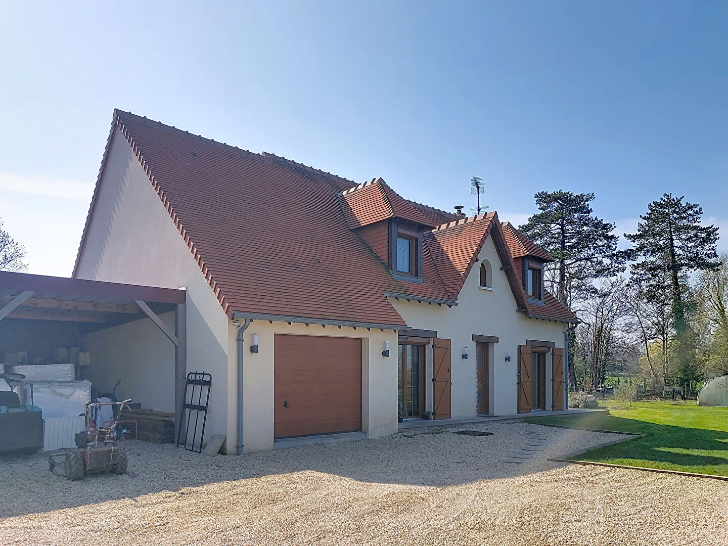 Un vaste carport d'environ 56 m² attenant à un garage d'environ 30 m² complètent l'ensemble, offrant de belles capacités de stationnement et de rangement.