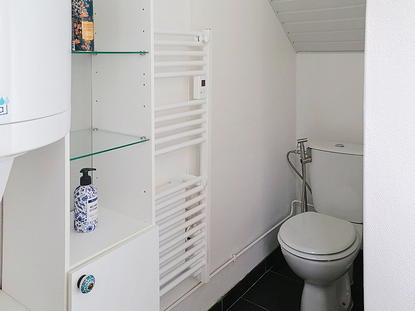 Au rez-de-chaussée, il se compose d'un beau séjour avec cuisine ouverte aménagée et d'une salle de bain avec wc et rangements.