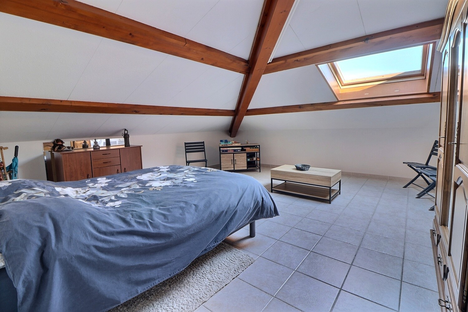 A l'étage : palier qui dessert deux grandes chambres sous charpente mansardée ( 28 et 30 m² ) et grande salle de bains avec WC.