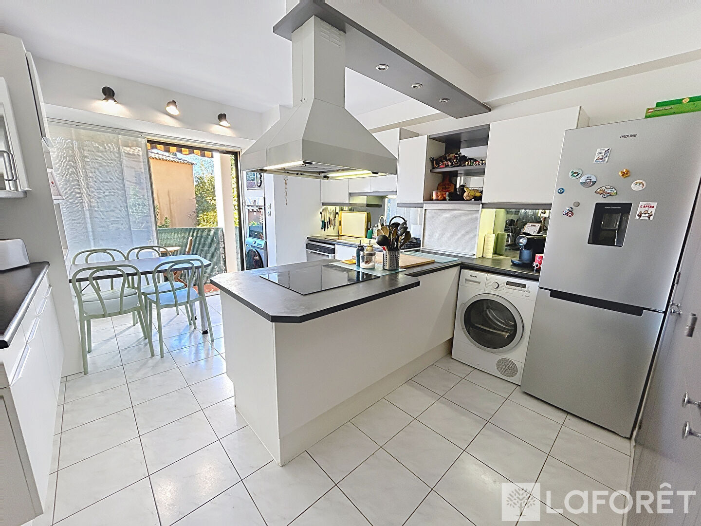 La cuisine est aussi spacieuse, permettant d'y prendre les repas en famille et donnant aussi sur une loggia.