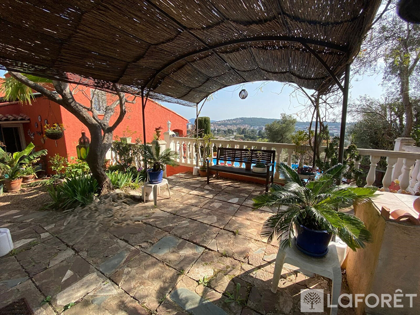 En extérieur, un aménagement atypique en restanques avec plusieurs terrasses dont une avec piscine et d'autres espaces avec végétation variée et de jolies vues dégagées.