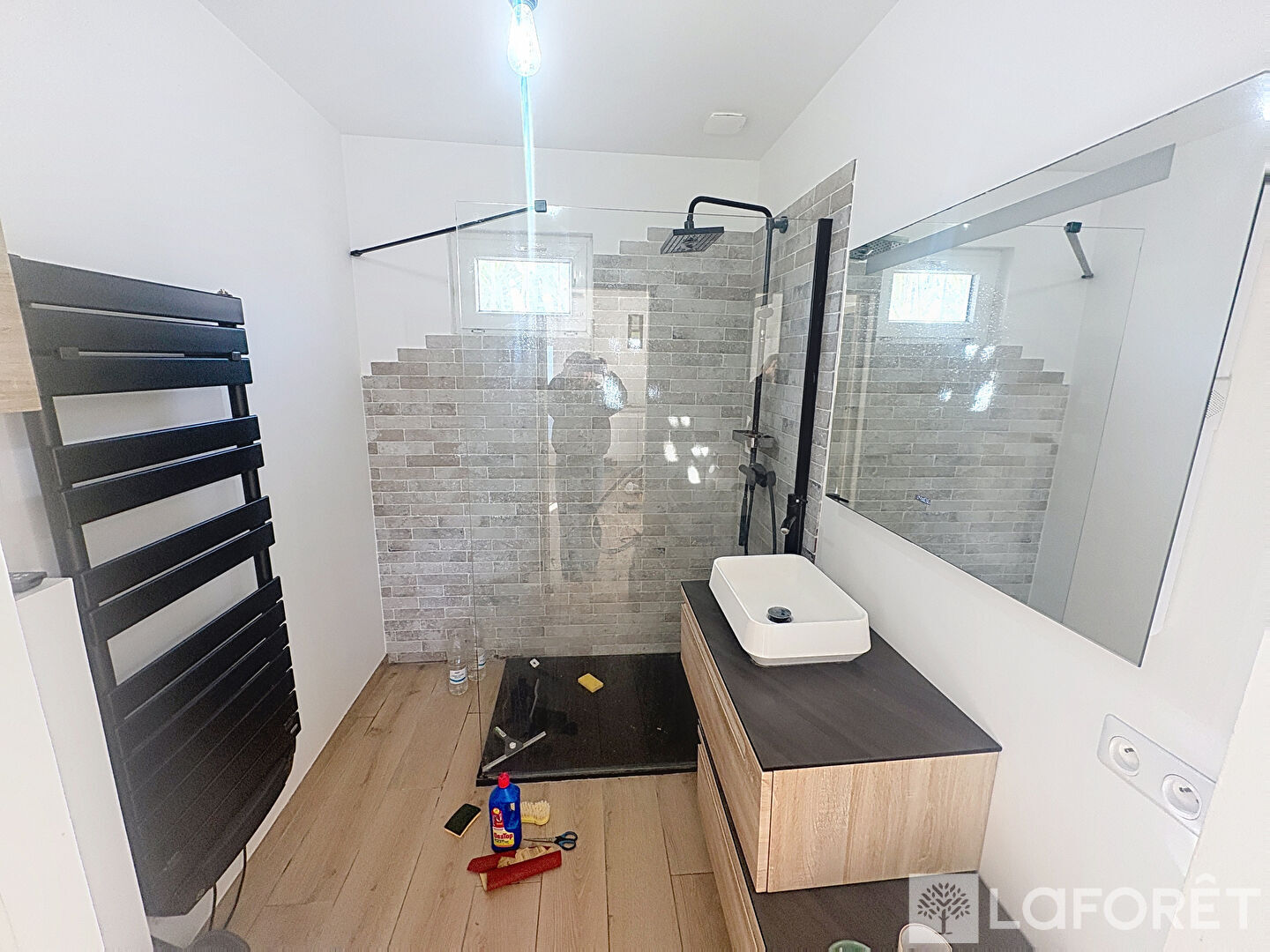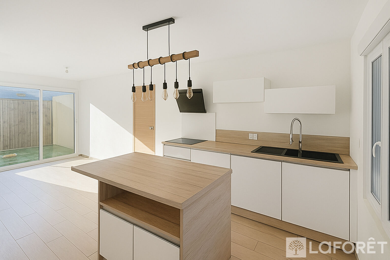 L'intérieur se compose d'une entrée ouvrant sur un séjour lumineux avec cuisine aménagée et îlot central, de deux chambres confortables, et d'une salle d'eau élégante équipée d'une douche à l'italienne et d'un WC suspendu.