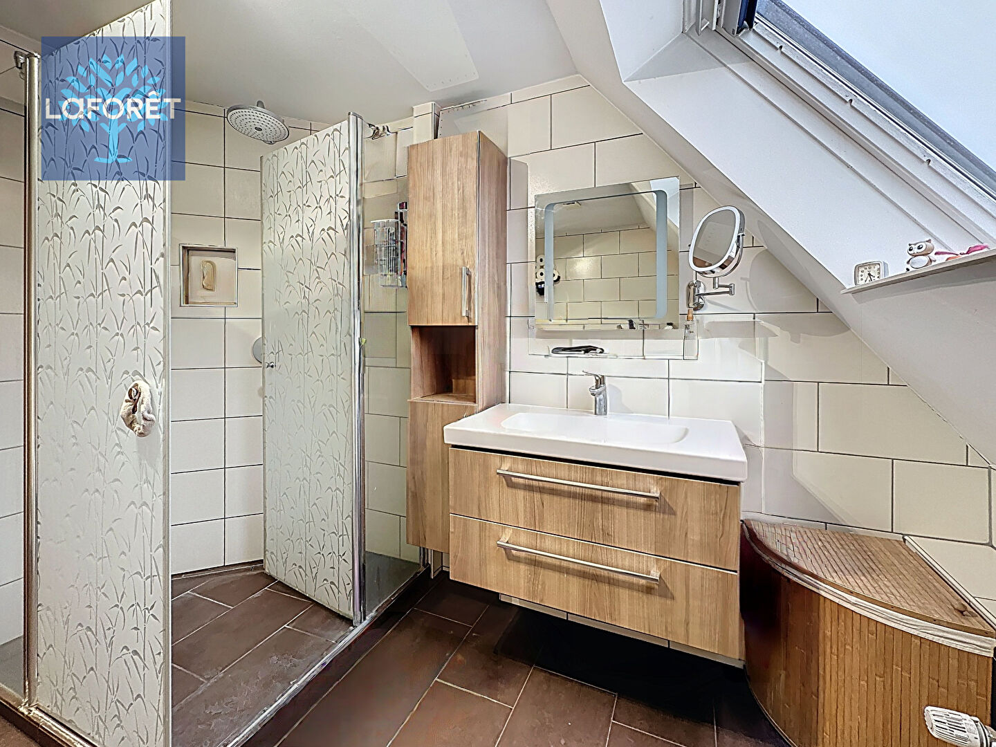 - Une salle de bains avec douche et WC.