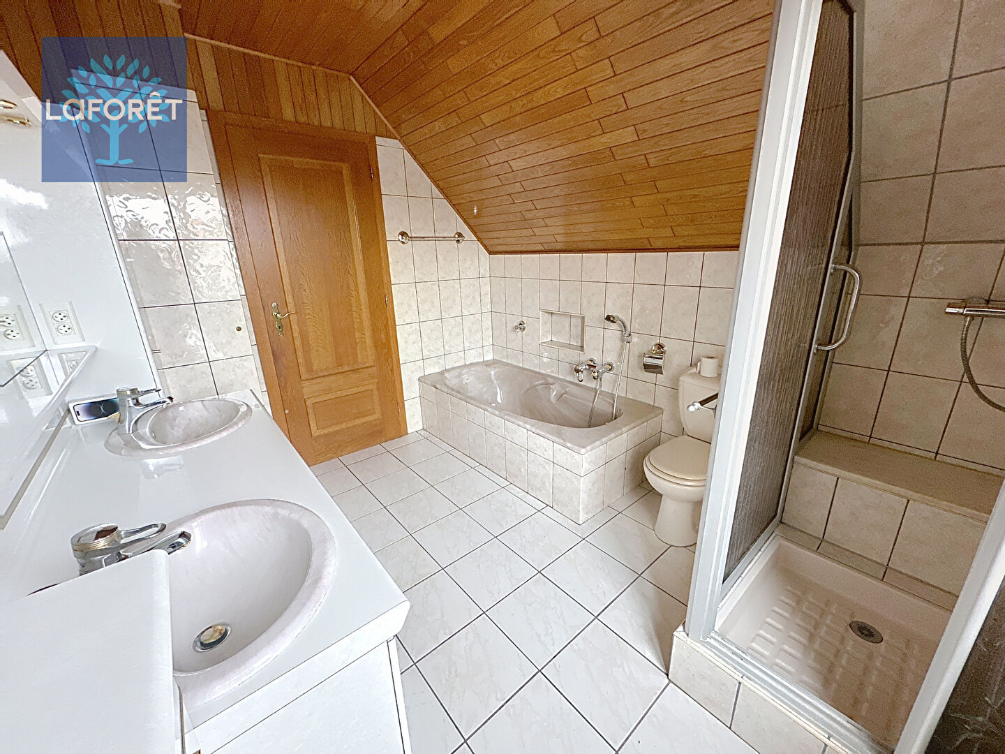 Vous trouverez également une grande salle de bains équipée d'une baignoire, d'une douche et d'un WC.