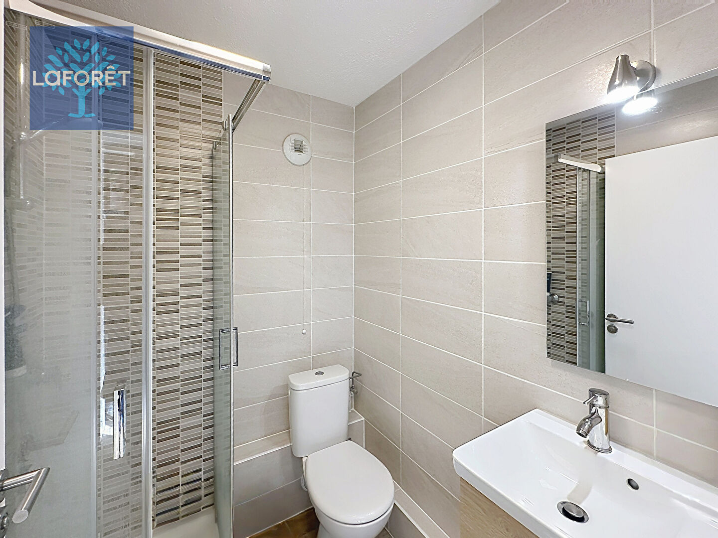 Une salle d'eau moderne entièrement carrelée avec meuble vasque, miroir et douche avec paroi