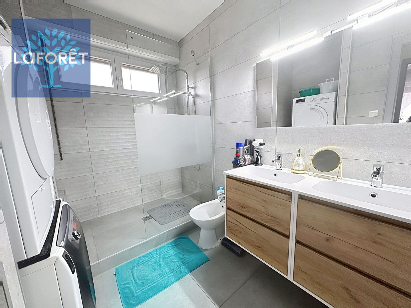 La salle d'eau, équipée d'une douche et d'une double vasque, apporte une ambiance soignée et contemporaine. Les WC sont séparés, ce qui renforce le confort d'usage du quotidien.