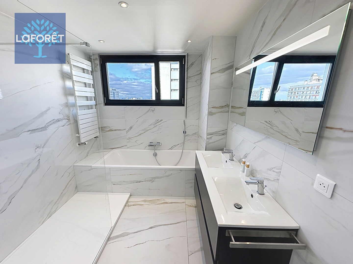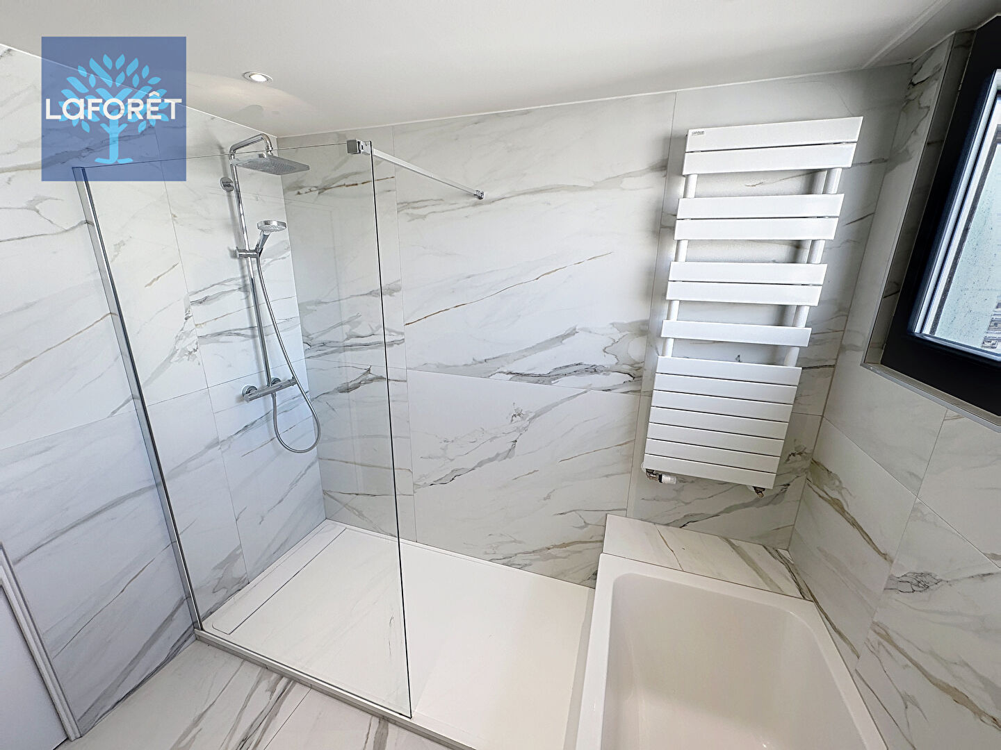 - Une salle de bains moderne équipée d'une baignoire, d'une douche et d'un meuble double vasque
