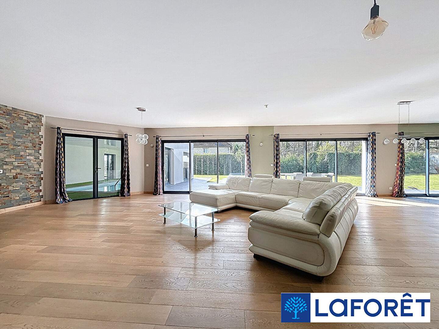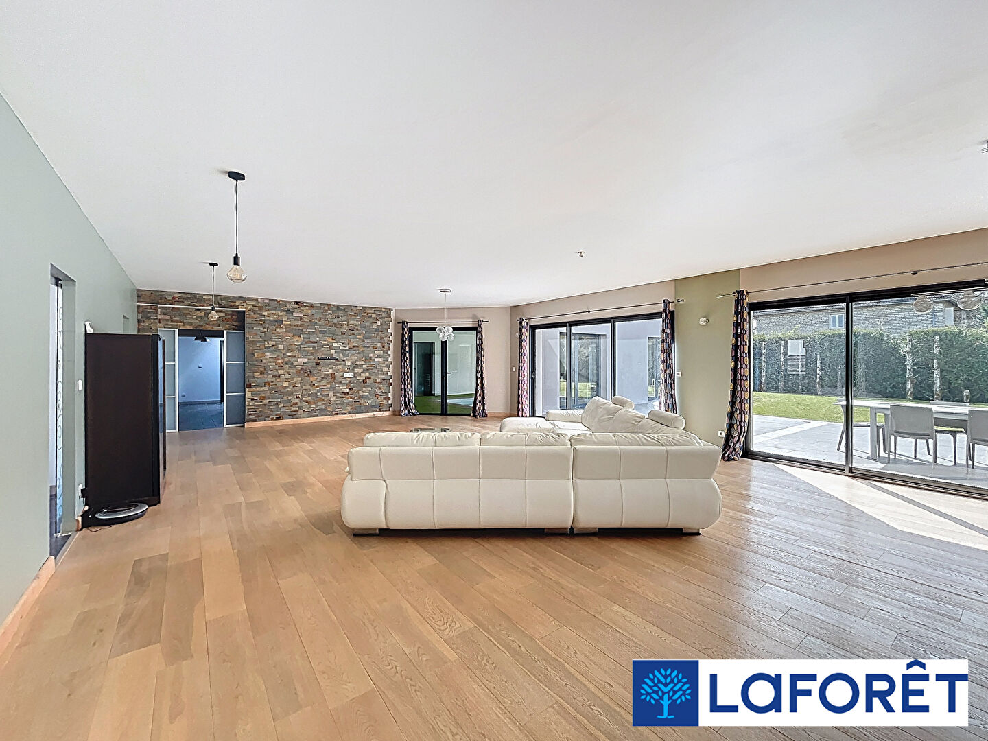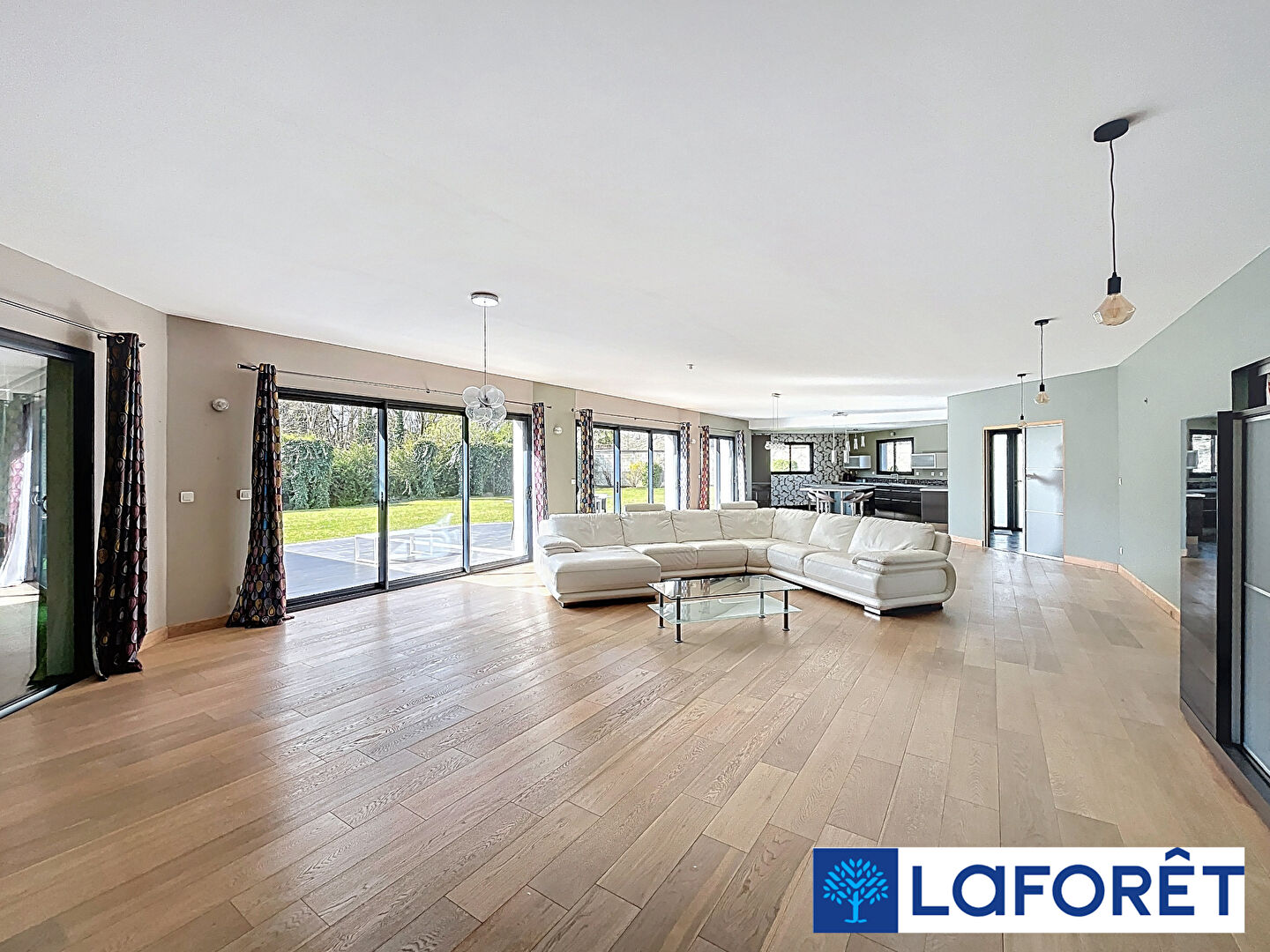Dès l'entrée, le ton est donné : plus de 300 m² de plain-pied, une pièce de vie spectaculaire de 80 m² baignée de lumière, ouverte sur une cuisine entièrement aménagée et équipée de plus de 30 m².