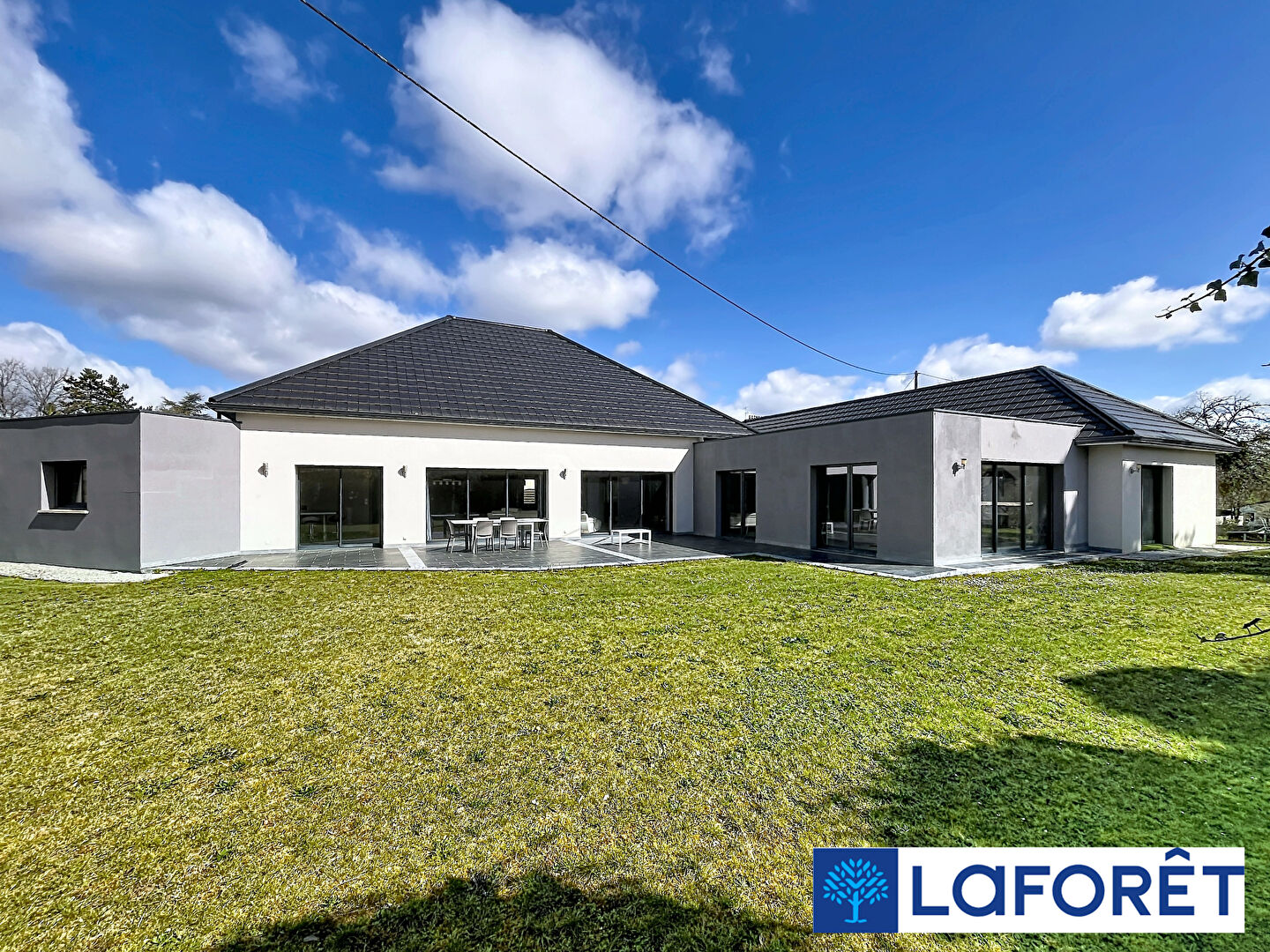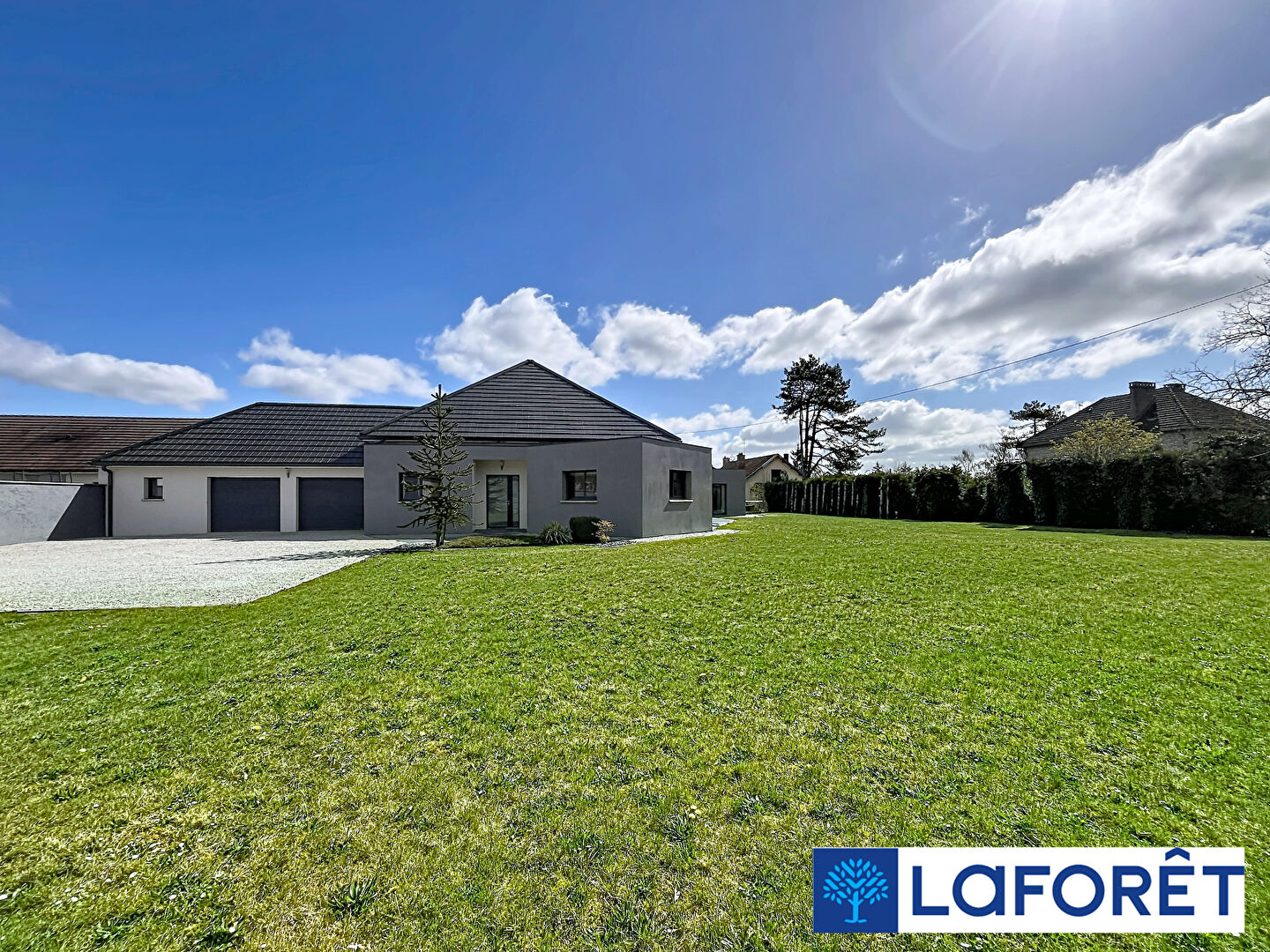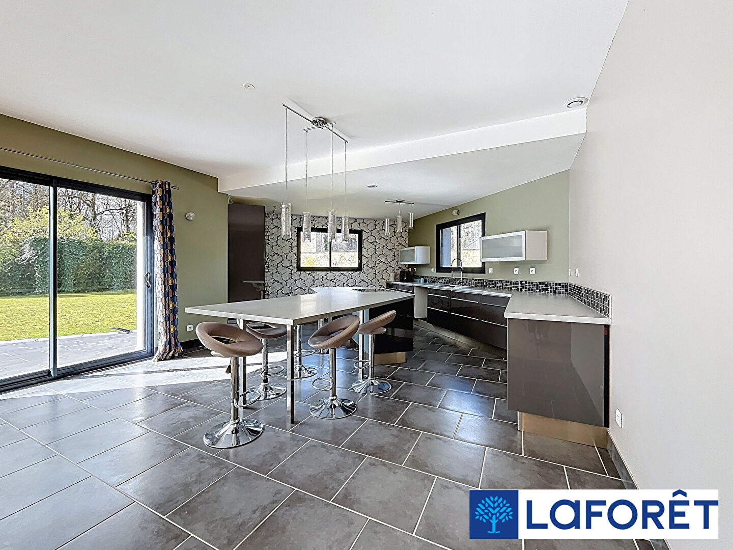 Dès l'entrée, le ton est donné : plus de 300 m² de plain-pied, une pièce de vie spectaculaire de 80 m² baignée de lumière, ouverte sur une cuisine entièrement aménagée et équipée de plus de 30 m².
