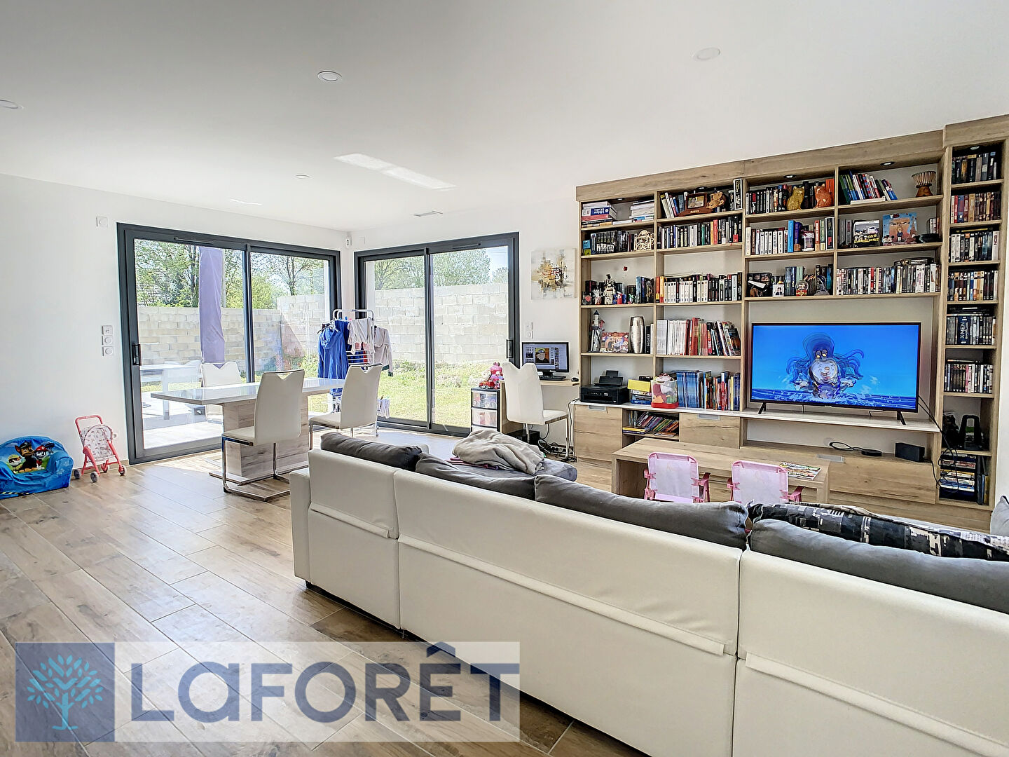 Maison, de plain pied, meublée avec cellier, très spacieuse et lumineuse, composée d'une cuisine équipée/aménagée, avec îlot central, ouverte sur le séjour, une salle de bain avec des WC, 2 chambres, des WC indépendants et une suite parentale avec salle d'eau. La maison se trouve sur un terrain de plus de 500m2 avec une terrasse.