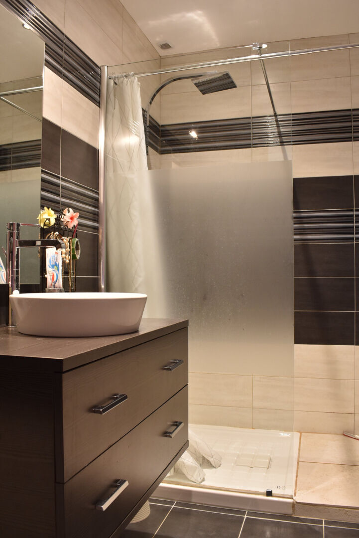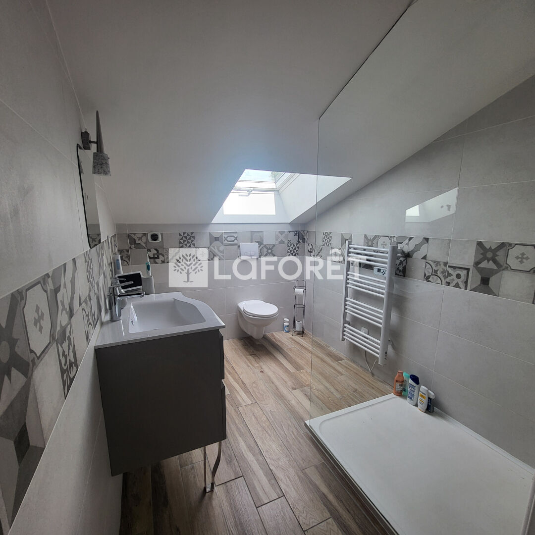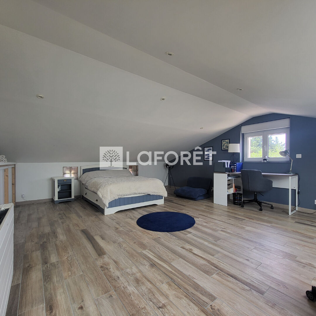 À l'étage, en sous pente un espace salon, une salle d'eau et 1 grande chambre avec velux et climatisation.