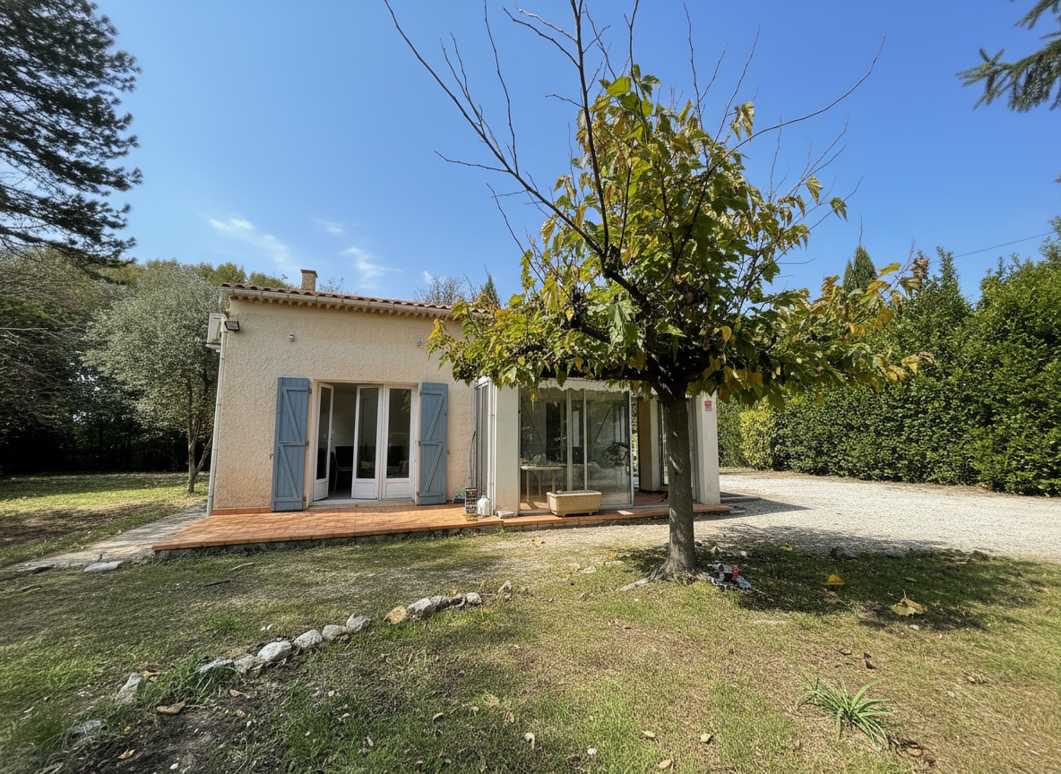 Nichée en campagne avec un très joli bord de sorgue, charmante maison quasiment de plain-pied, constituée d'une cuisine aménagée donnant sur une grande veranda, une pièce de vie lumineuse, deux chambres, une salle d'eau et WC séparé, une pièce de stokage et une buanderie compléte ce rez de chaussée.