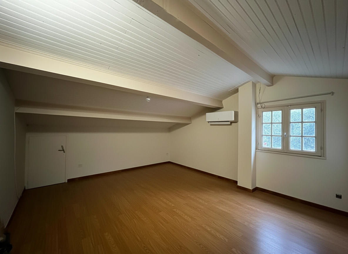 A l'étage, vous bénéficiez d'une grande chambre sous pente, de 23m² au sol, avec pièce d'eau attenante équipée d'un WC sanibroyeur et d'un grenier de 25m² a aménager a votre gout.