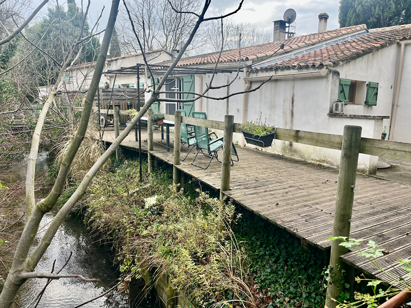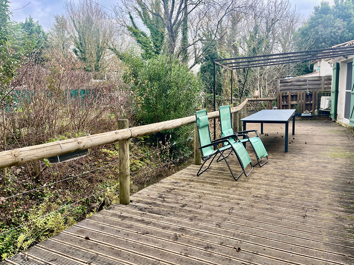 Elle dispose en extérieur d'une belle et large terrasse en bois en bordure du cours d'eau , un petit jardin et de places de parking à proximité .