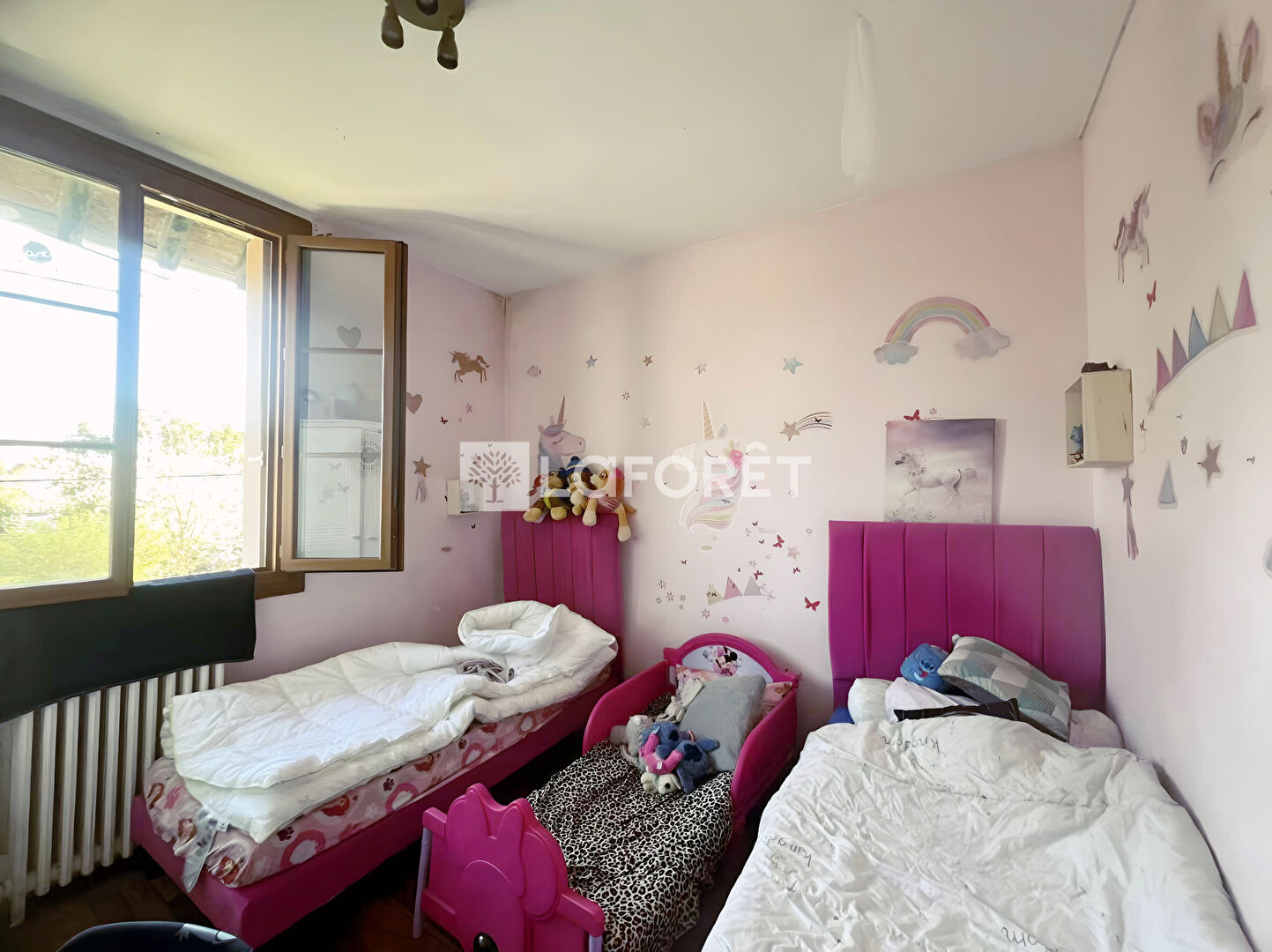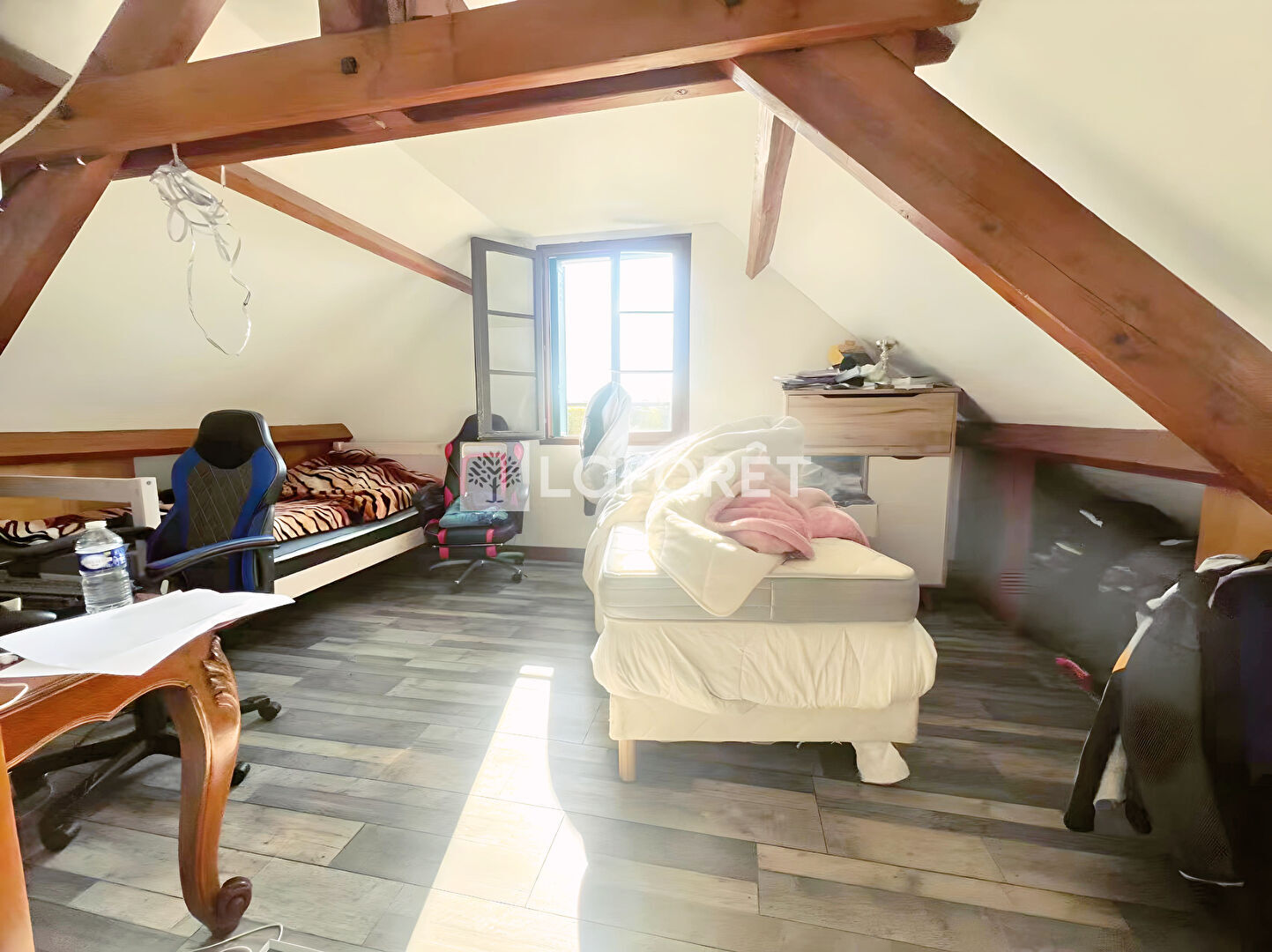 À l'étage : deux chambres confortables, ainsi qu'une pièce sous combles aménagée en troisième chambre.