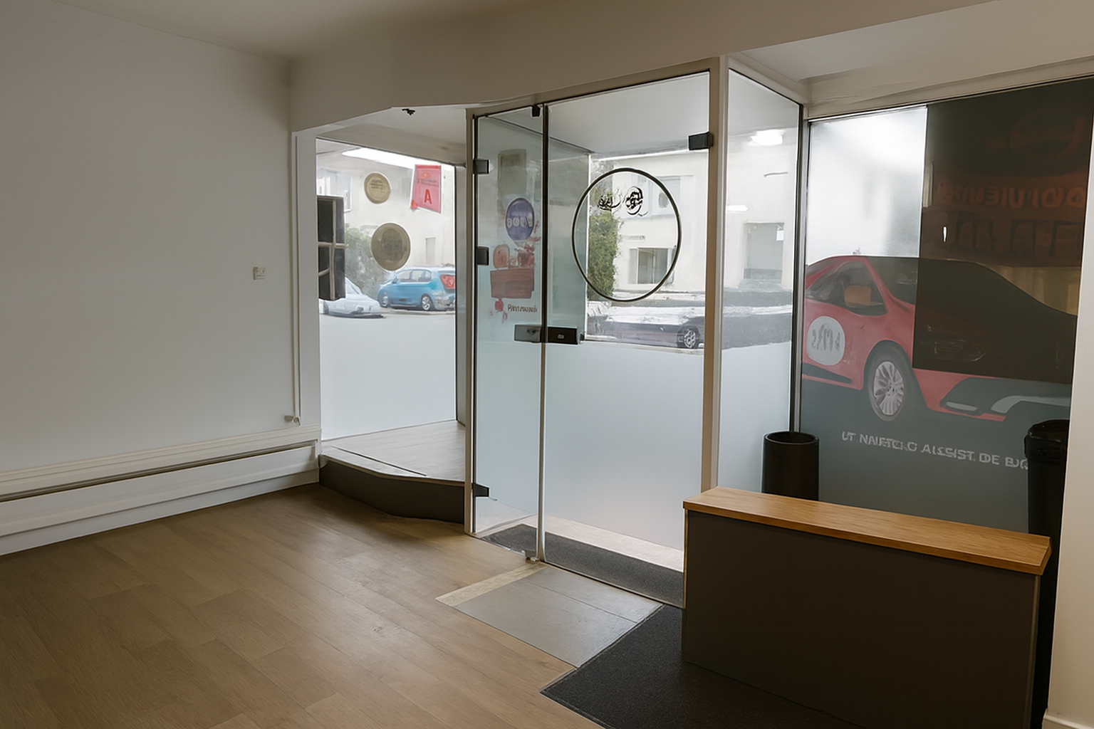 un bureau d'accueil avec vitrine