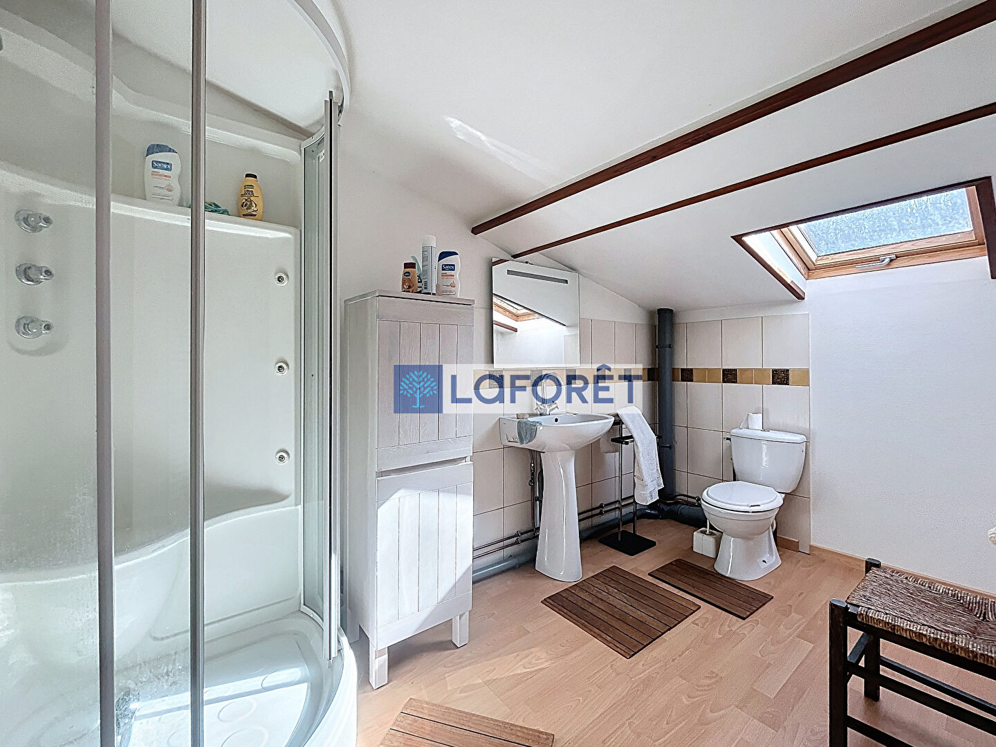 A l'étage, 2 chambres mansardées et d'une salle d'eau avec WC.