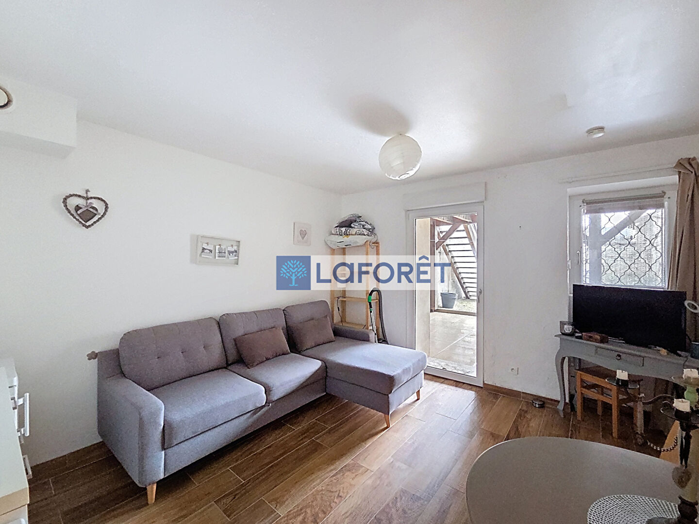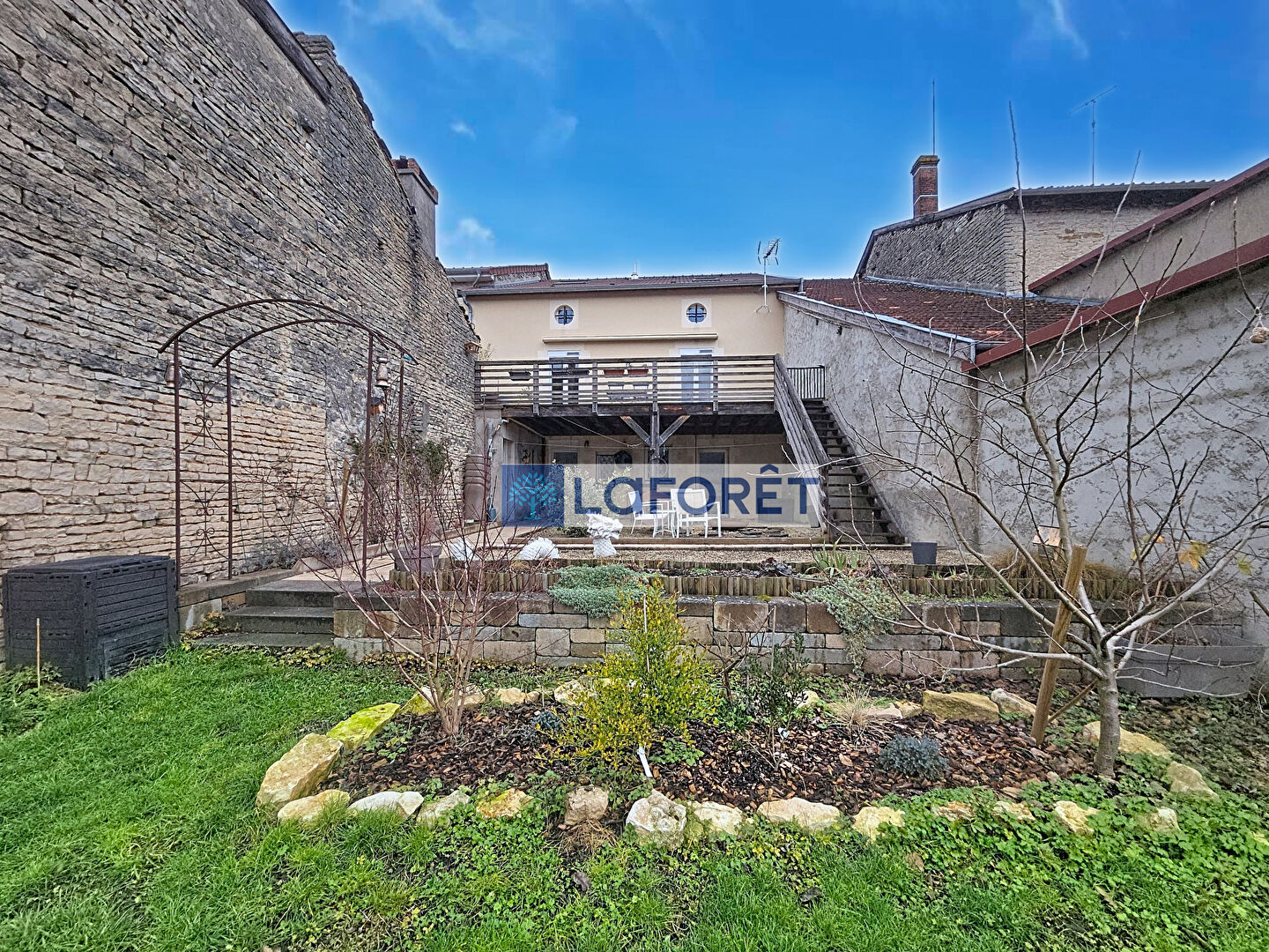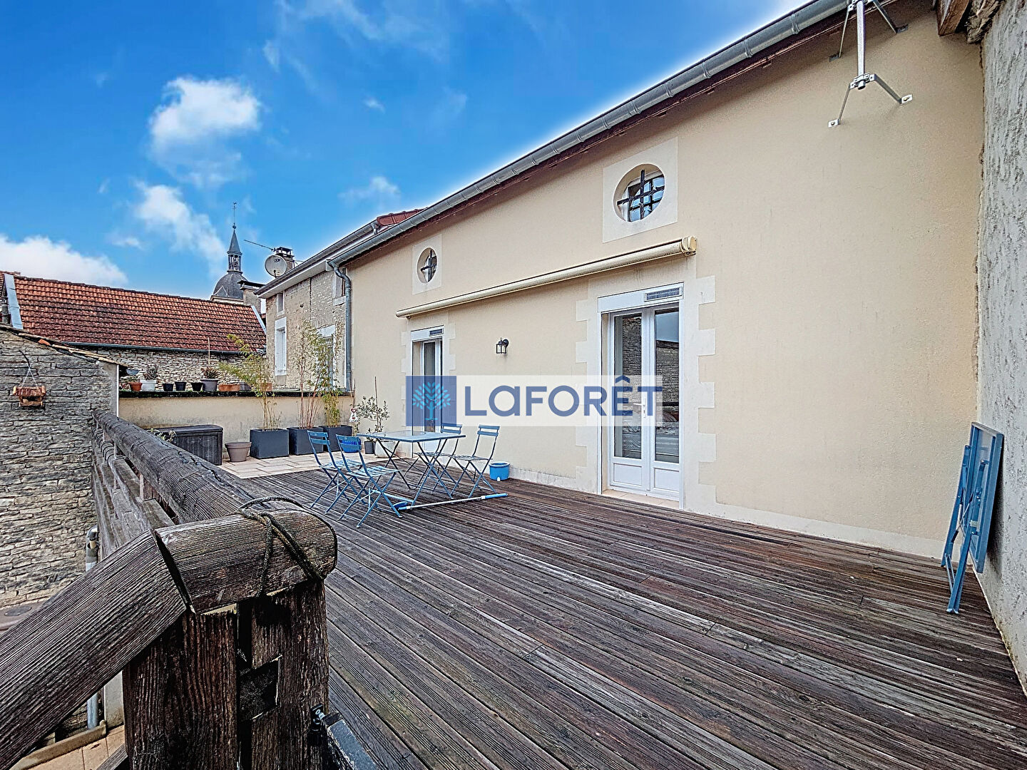 Cette chaleureuse demeure vous offrira également une jolie terrasse suspendue en bois sans vis à vis donnant vue sur un jardin attenant.