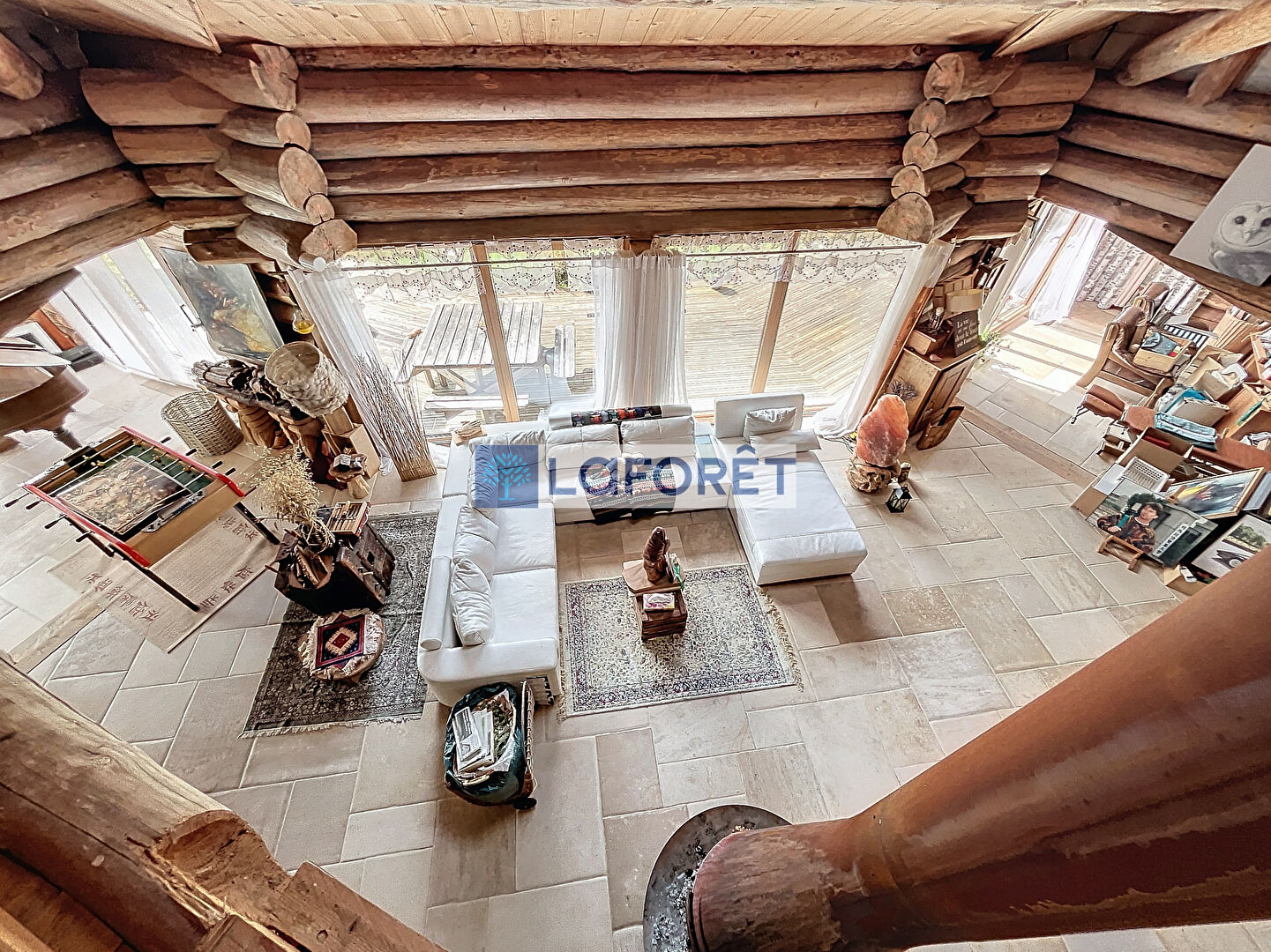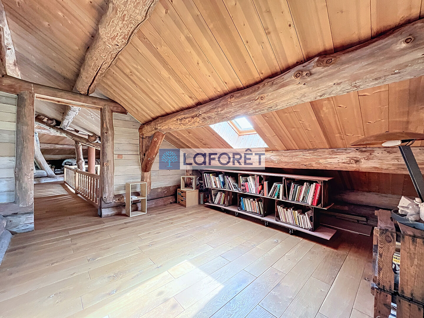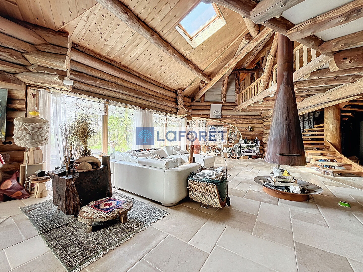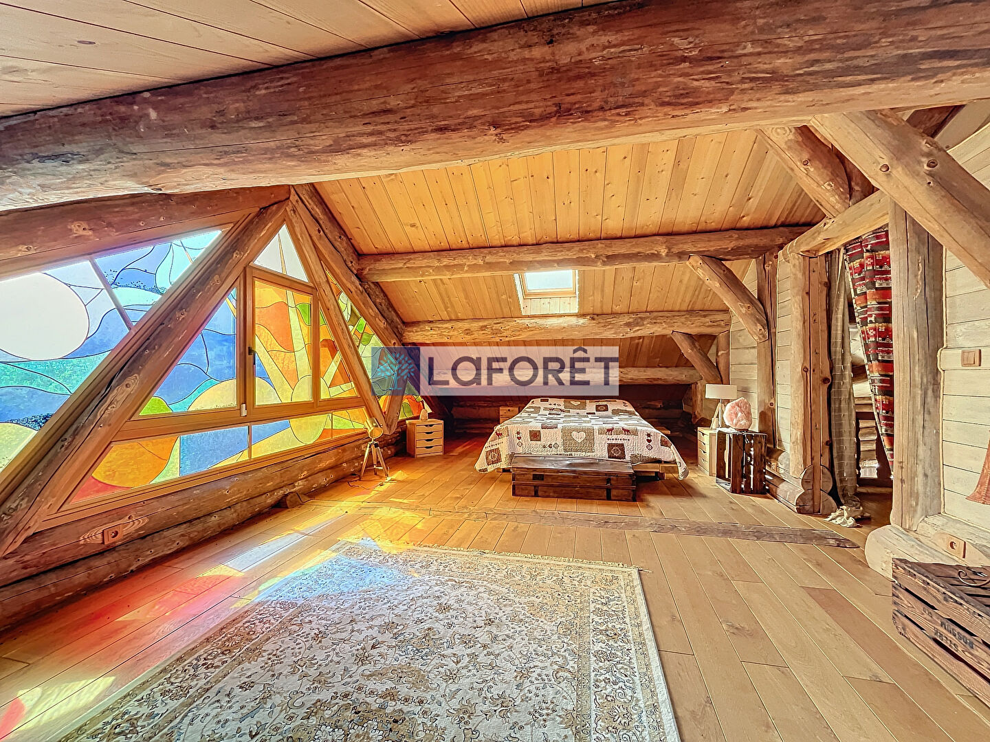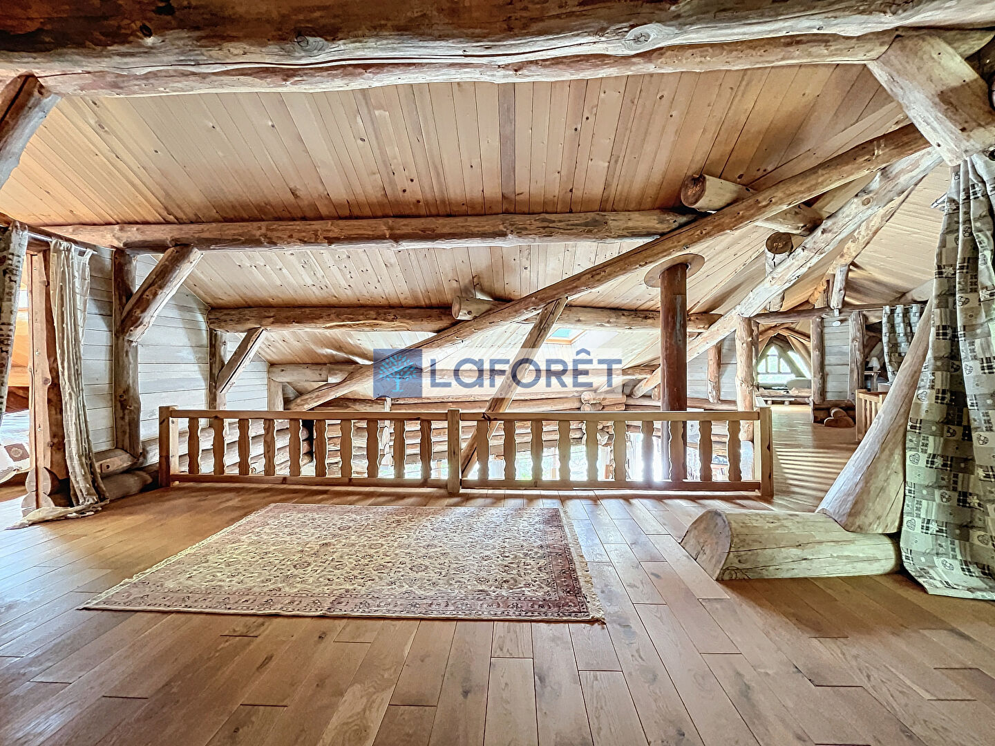 L'accès à l'étage s'effectue via un escalier amenant à une mezzanine surplombant le salon. Cette dernière dessert une salle de bains, une bibliothèque ainsi que trois belles chambres sous charpente apparentes. Dans l'une d'entre elles, des vitraux chatoyants confèrent à la pièce une atmosphère hors du temps. La terrasse orientée plein Sud se voit prolongée par un jardin sauvage qui vient se fondre avec "LAFORÊT" pour une sensation d'être coupé du monde.