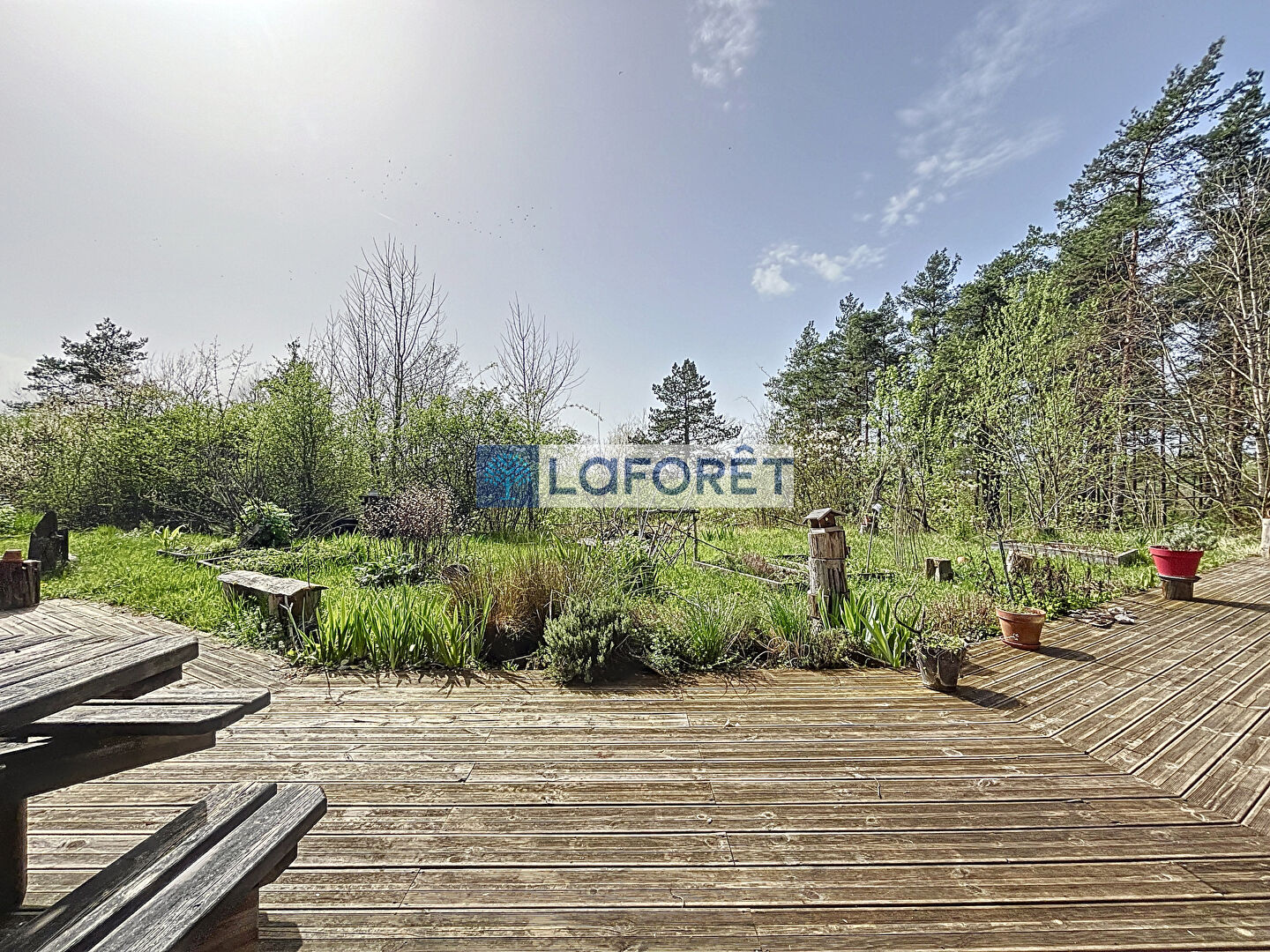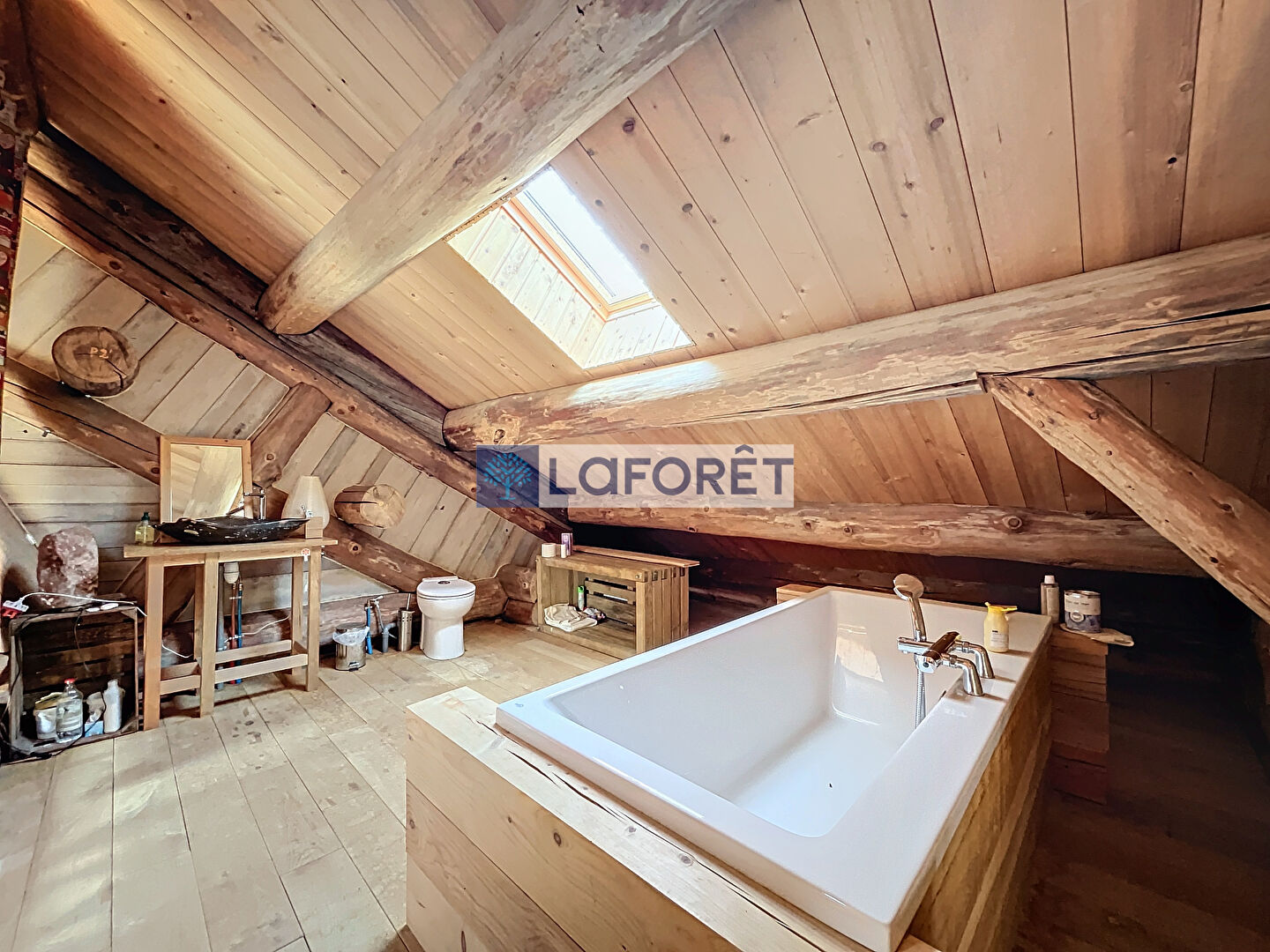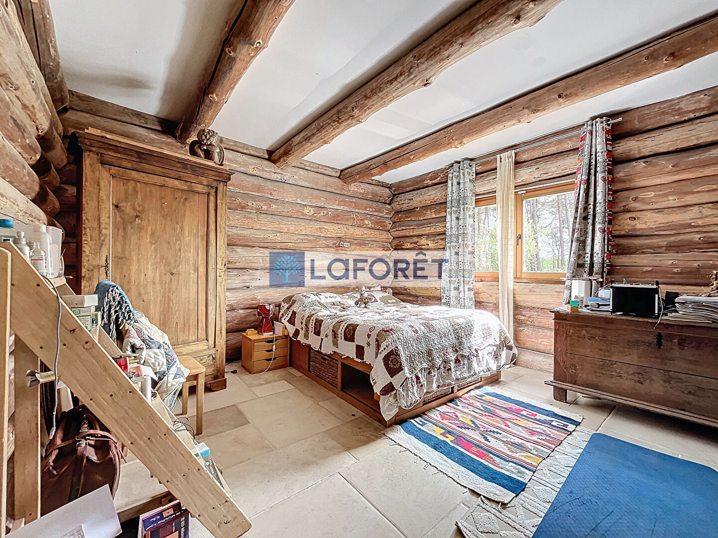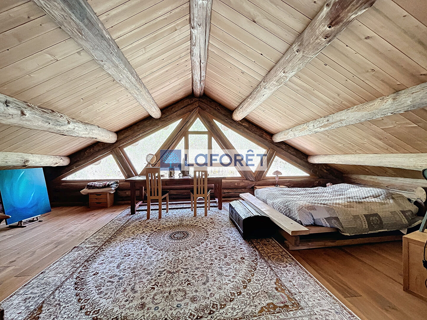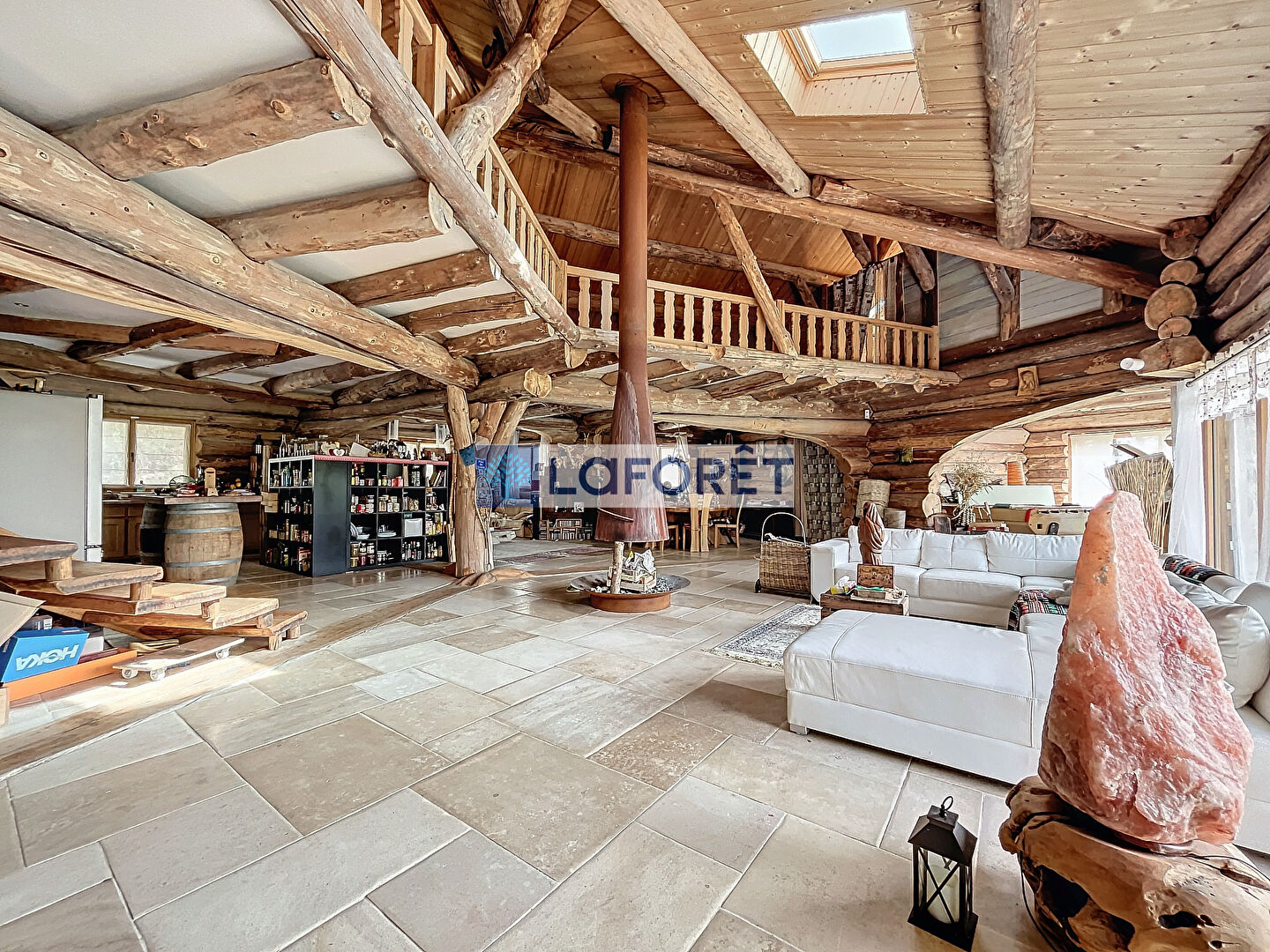 L'accès à l'étage s'effectue via un escalier amenant à une mezzanine surplombant le salon. Cette dernière dessert une salle de bains, une bibliothèque ainsi que trois belles chambres sous charpente apparentes. Dans l'une d'entre elles, des vitraux chatoyants confèrent à la pièce une atmosphère hors du temps. La terrasse orientée plein Sud se voit prolongée par un jardin sauvage qui vient se fondre avec "LAFORÊT" pour une sensation d'être coupé du monde.