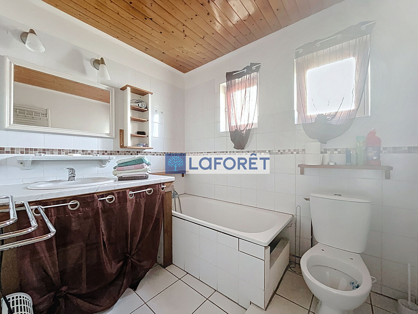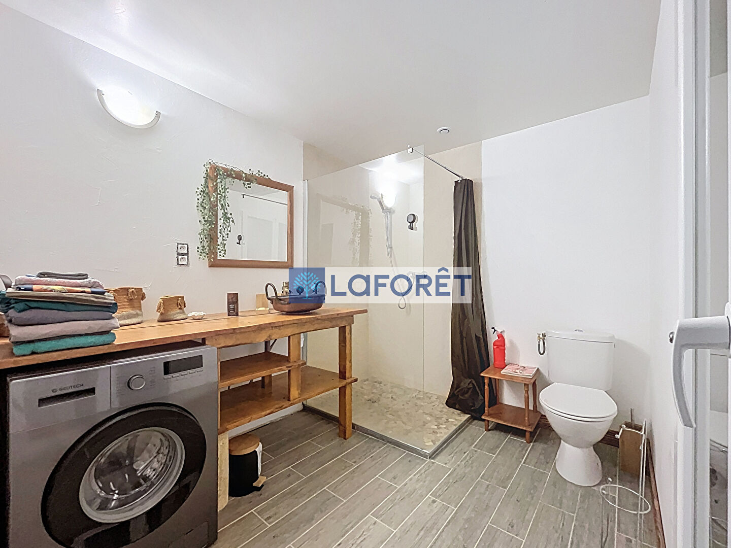 Il est composé au rez-de-chaussée, d'une grande entrée, une cuisine avec accès au jardin à l'arrière, un salon/salle à manger, une chambre, une salle d'eau avec WC et une salle de bains avec WC.