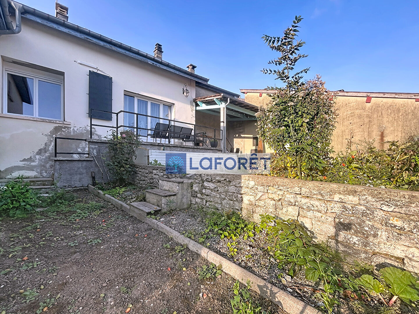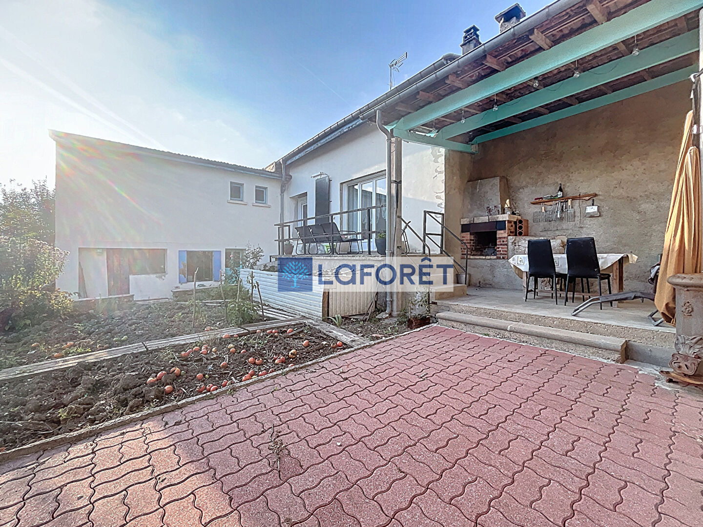 A l'arrière de la maison, un espace terrasse couverte, un espace potager et un espace vert avec 2 espaces de rangements sous la maison.