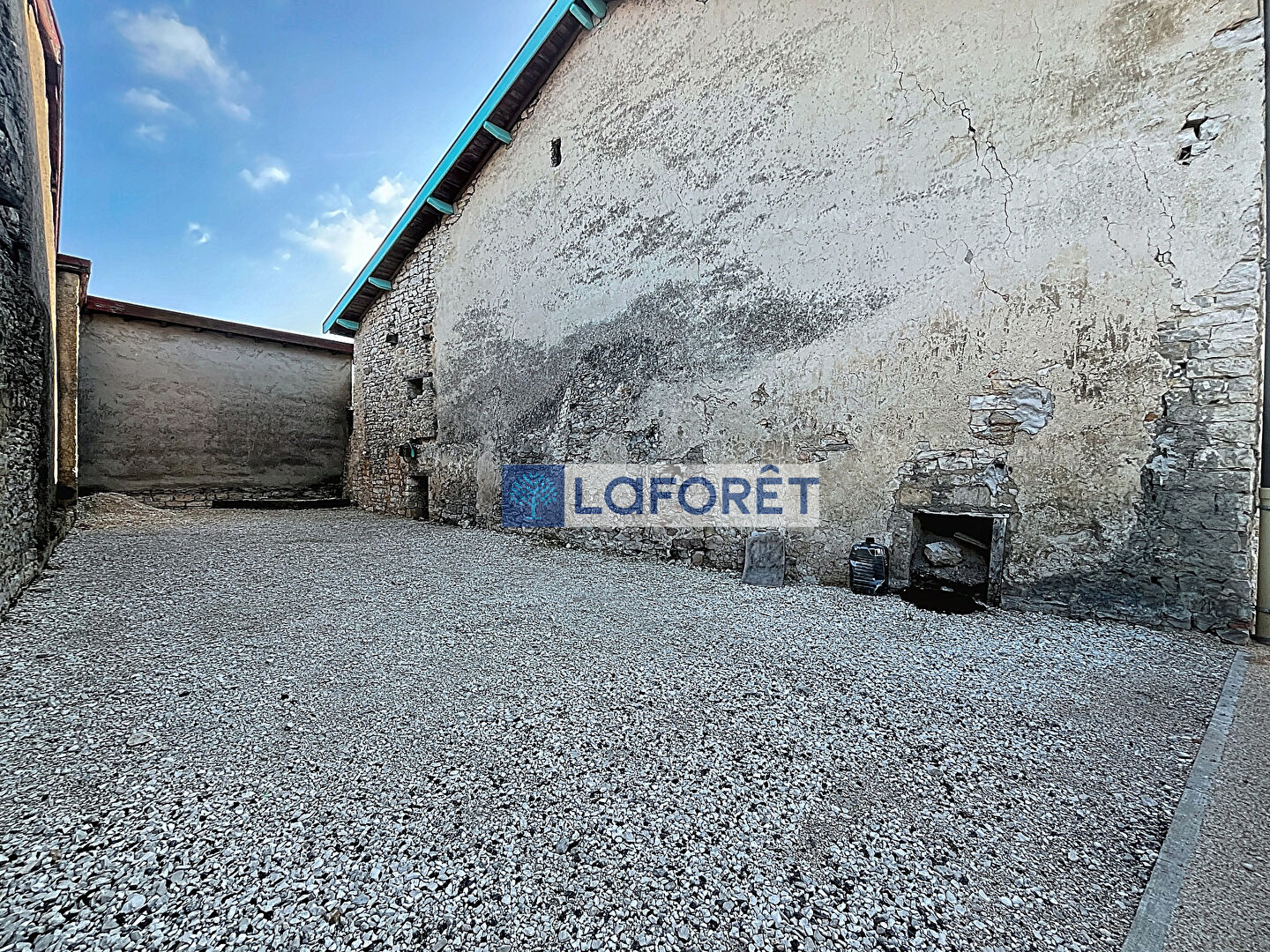 Une grange attenante à la maison à rénover (potentiel d'agrandissement de la maison et une cour gravillonnée à côté de celle-ci.