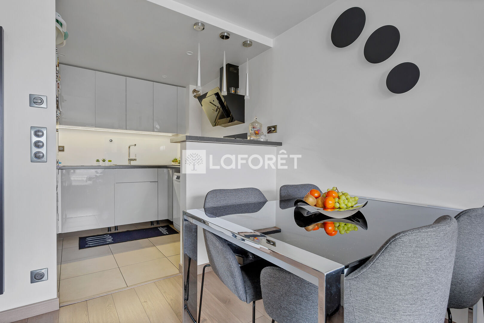 La cuisine ouverte, moderne et entièrement équipée, s'intègre parfaitement à la pièce de vie pour un ensemble fonctionnel et chaleureux.