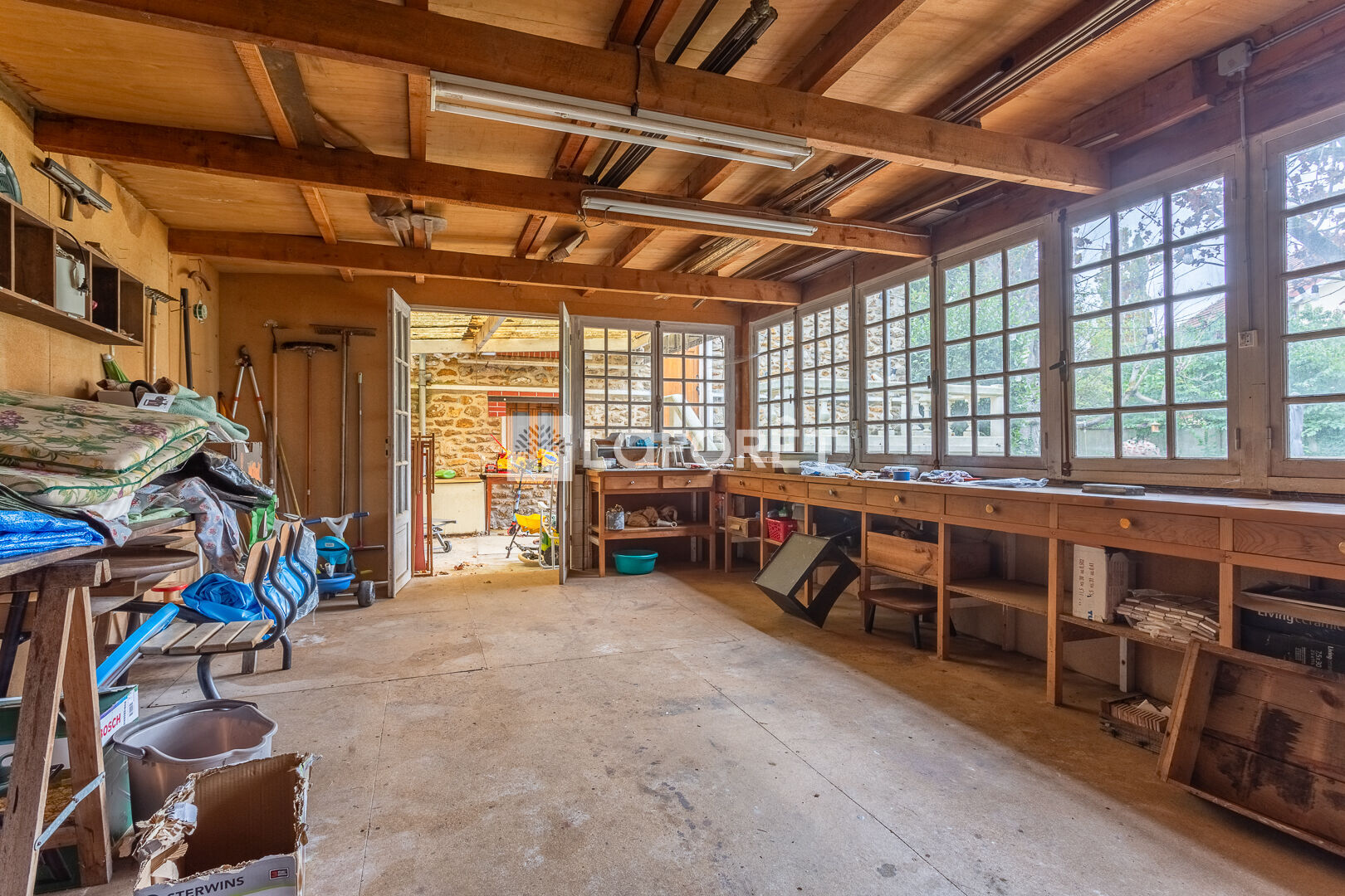A l'exterieur on y trouve un atelier d'ebèniste qui donne sur un grand jardin sans vis à vis.