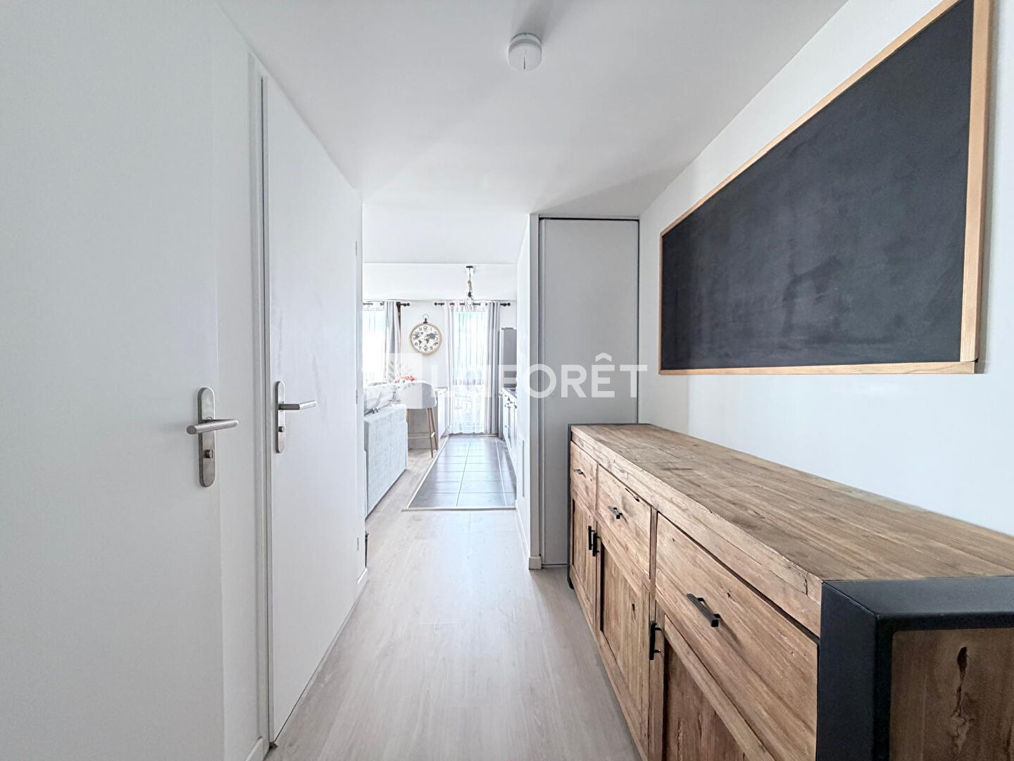 Entrée, séjour avec un coin cuisine, une salle de bains, deux chambres et WC séparés.