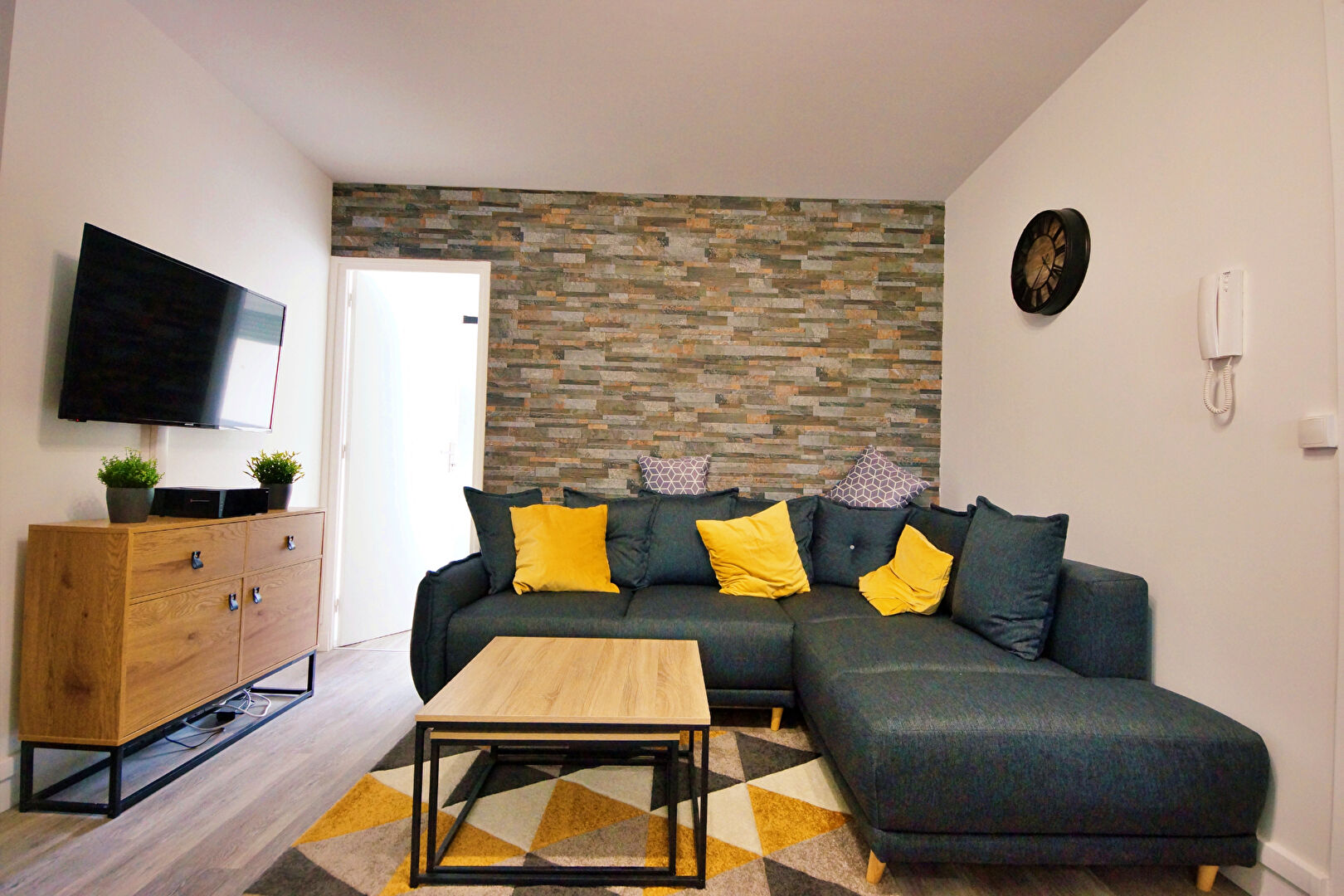 Cuisine américaine ouverte sur le séjour. Réfrigérateur, congélateur, four, lave-linge, sèche-linge, micro-onde, vaisselle, machine à café, canapé d'angle, une grande table avec ses chaises si vous souhaitez diner ensemble + TV connectée 108 cm sans oublier la box internet avec la fibre haut débit !