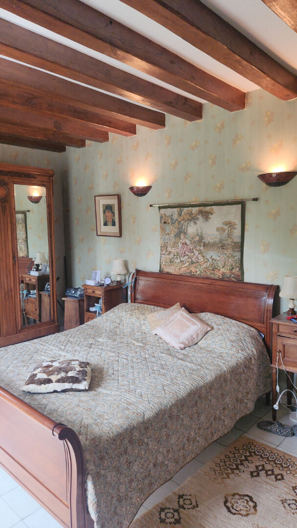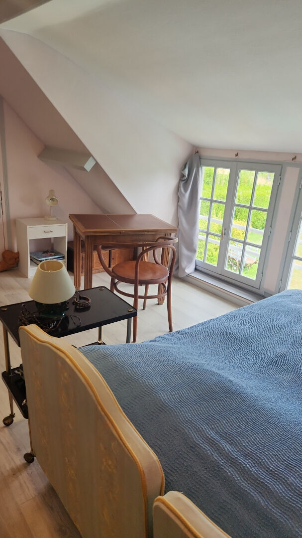 Grande chambre mansardée baignée de lumière naturelle grâce à une large fenêtre à trois battants. Parquet flottant au sol et vue dégagée sur le jardin. Espace chaleureux sous les toits.