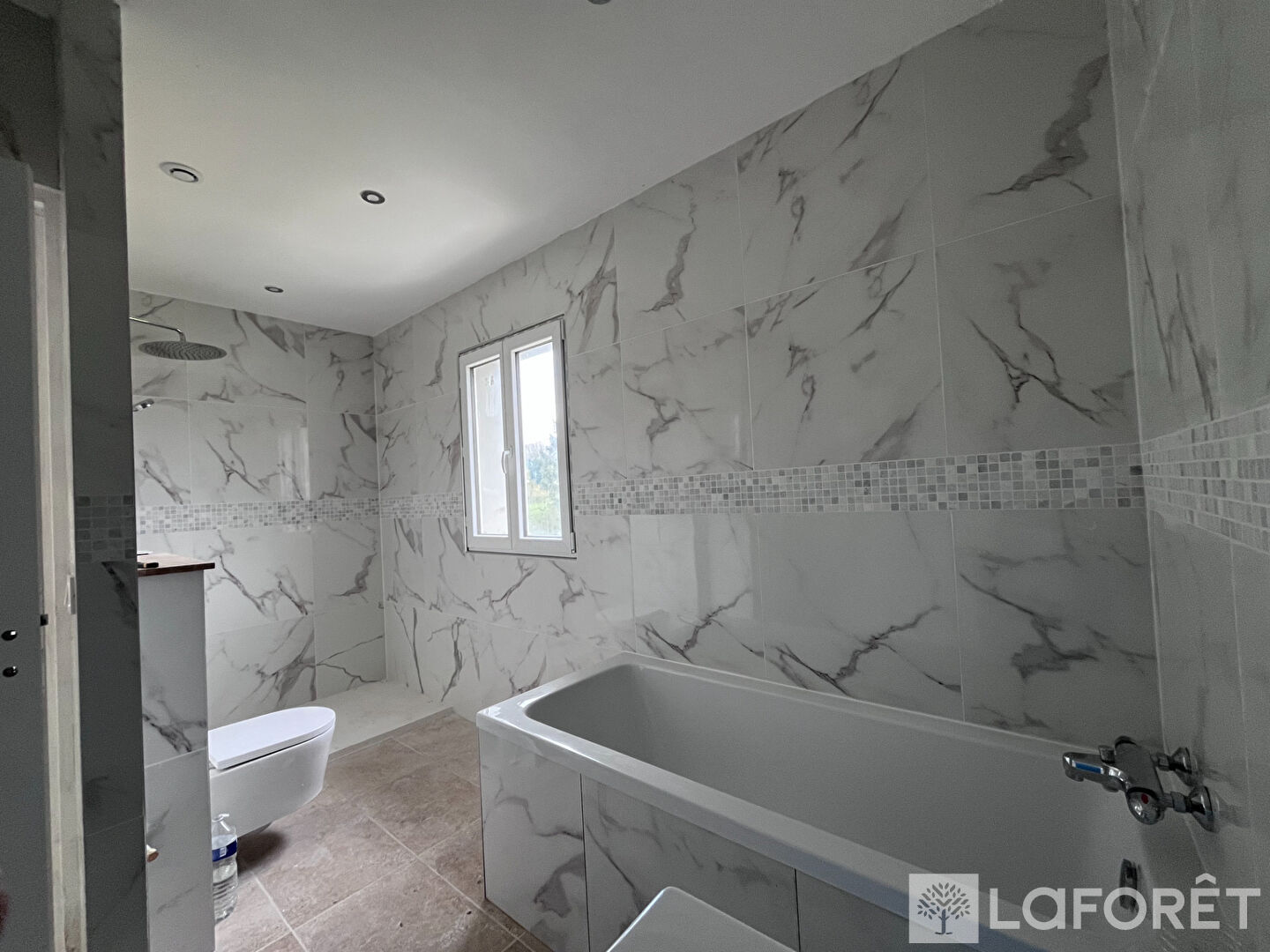 Dès l'entrée, vous serez séduits par une belle pièce de vie lumineuse comprenant un vaste salon séjour avec cuisine aménagée et ouverte, le tout sublimé par un élégant carrelage effet marbre.