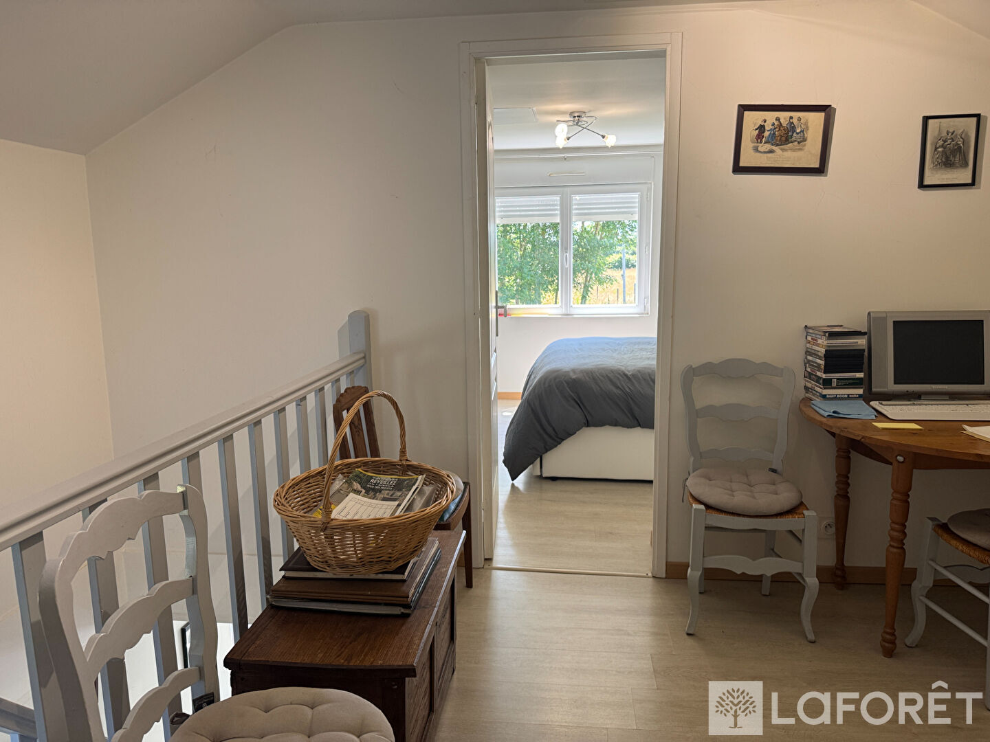 A l 'étage : Beau palier , 2 chambres dont une avec WC et lavabo.