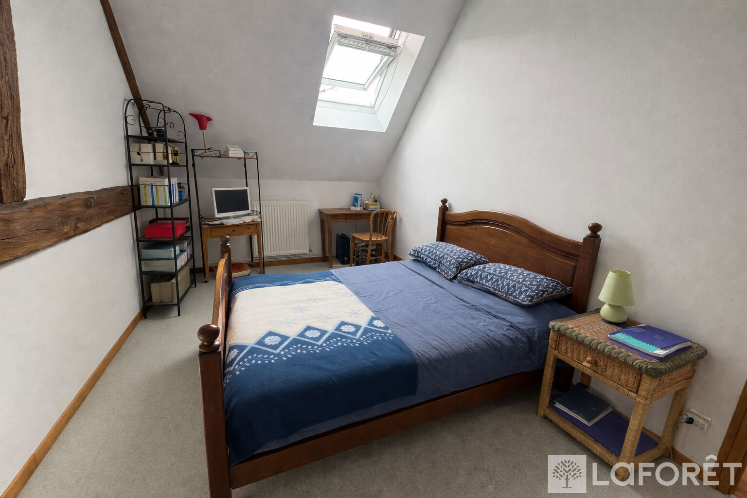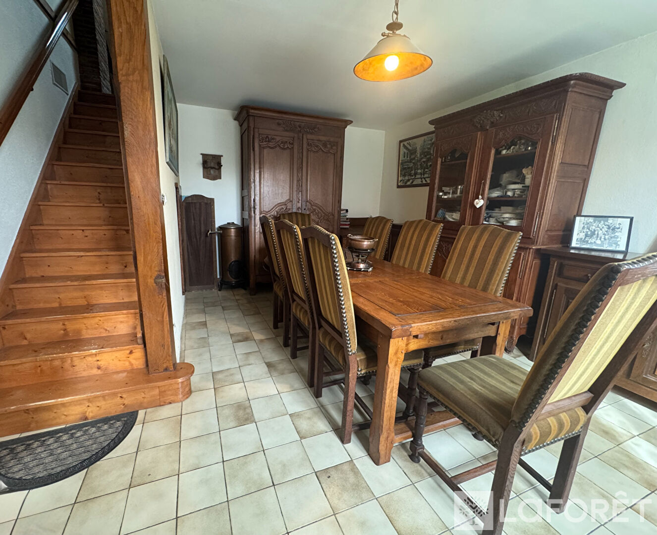 Au rez-de-chaussée, vous découvrirez une cuisine aménagée et équipée en bois, un salon avec cheminée (poêle à bois), une salle à manger, un bureau, une salle de bains avec WC ainsi qu'un bûcher.