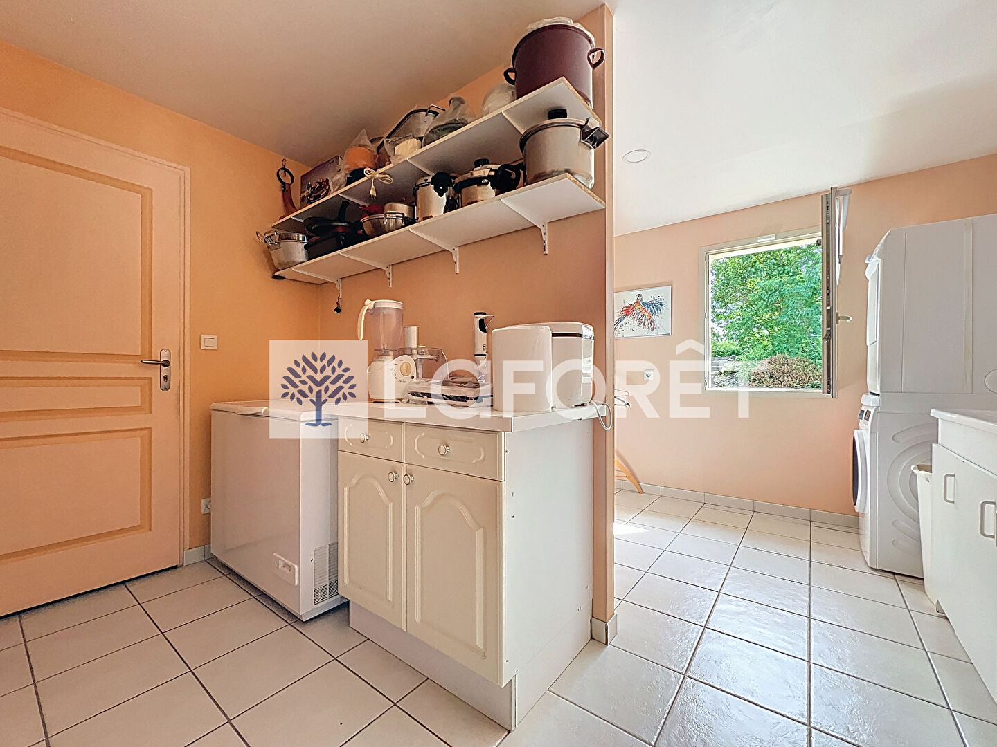 Vous y découvrirez une pièce de vie lumineuse de 43 m² avec une belle hauteur sous plafond et une cheminée insert neuve, une cuisine aménagée et équipée, un coin bureau ou salon de 12 m2, ainsi qu'une buanderie de 15 m².