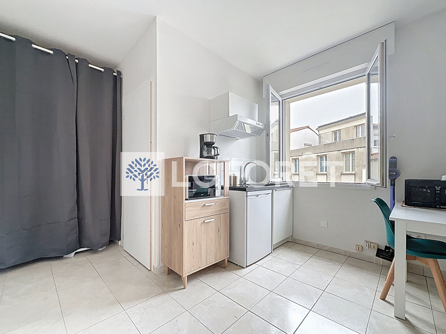 Charmant studio meublé de 28m2 disponible de suite comprenant une pièce de vie lumineuse avec placard, une kitchenette (frigo, plaques de cuisson), un coin nuit, salle d'eau avec WC.