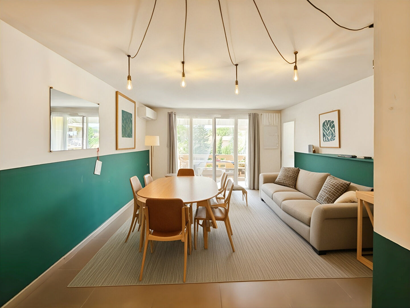 Cet espace de 62 m² bénéficie d'une exposition sud-ouest qui inonde le séjour de lumière naturelle. Profitez d'une terrasse offrant une vue dégagée sur le jardin et un aperçu de la mer, idéal pour vos moments de détente en extérieur.