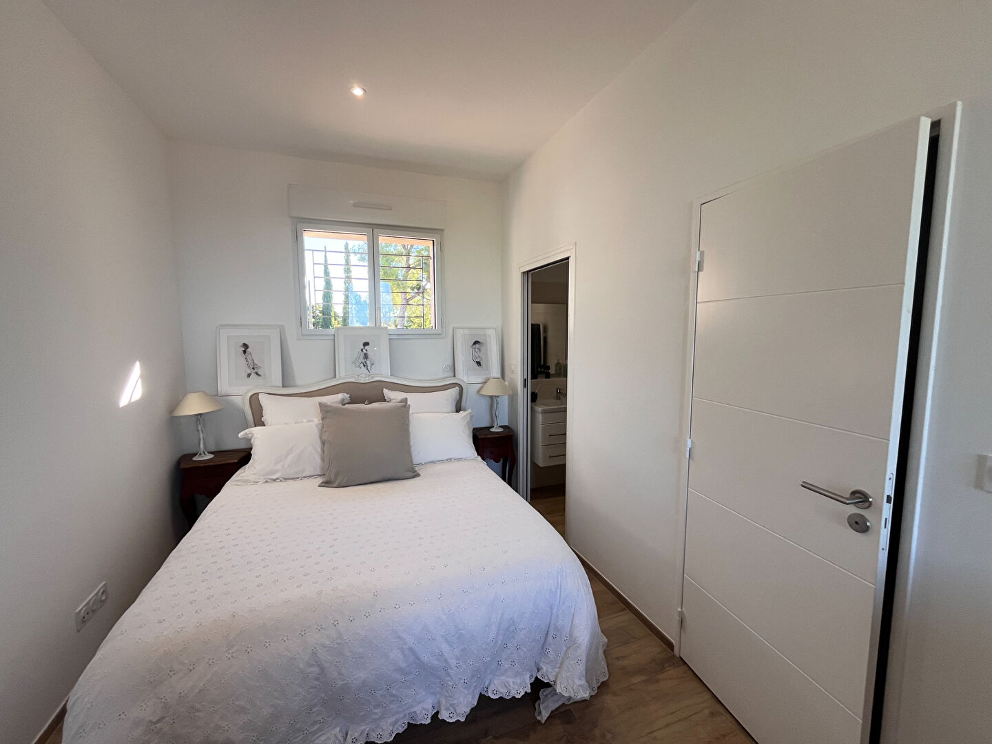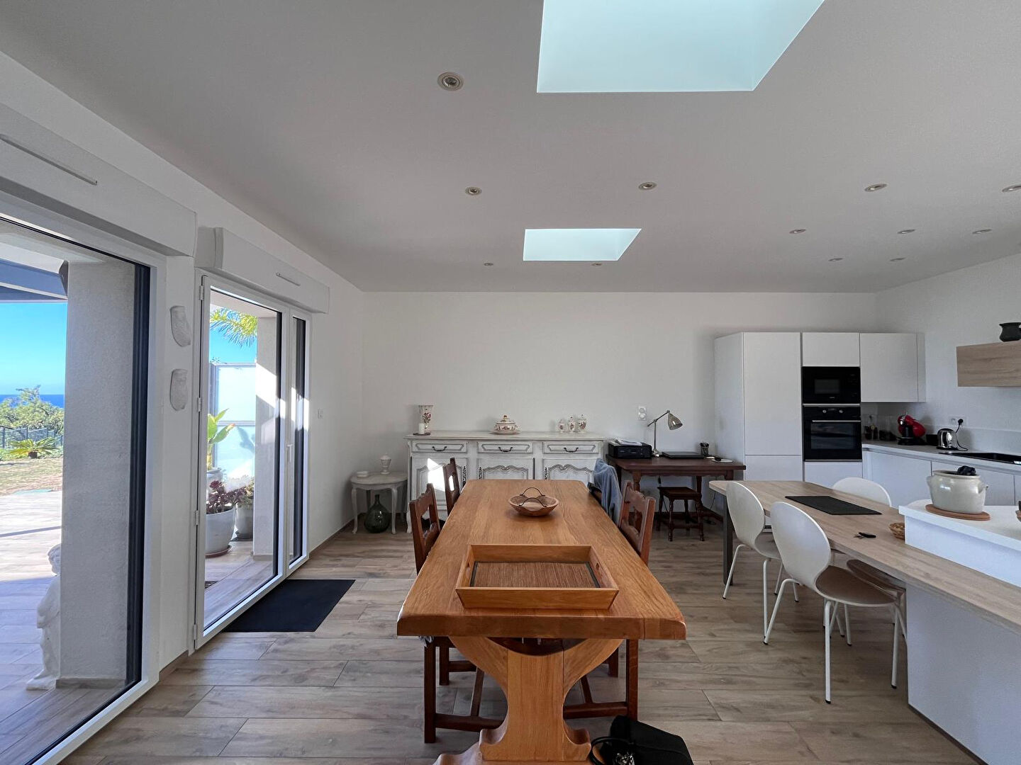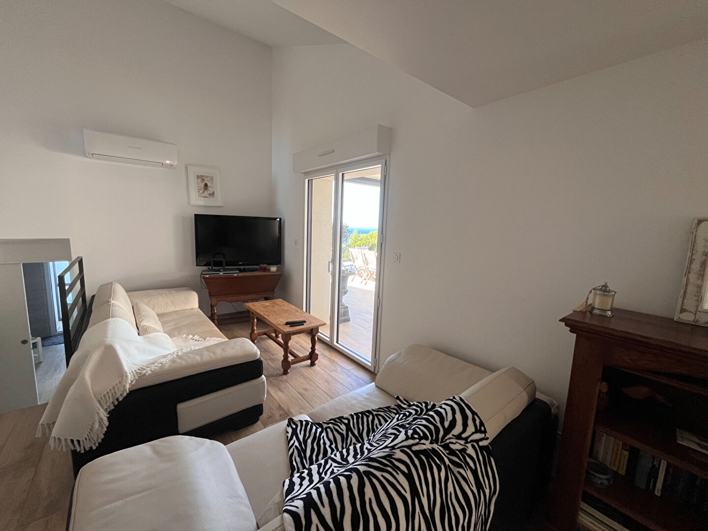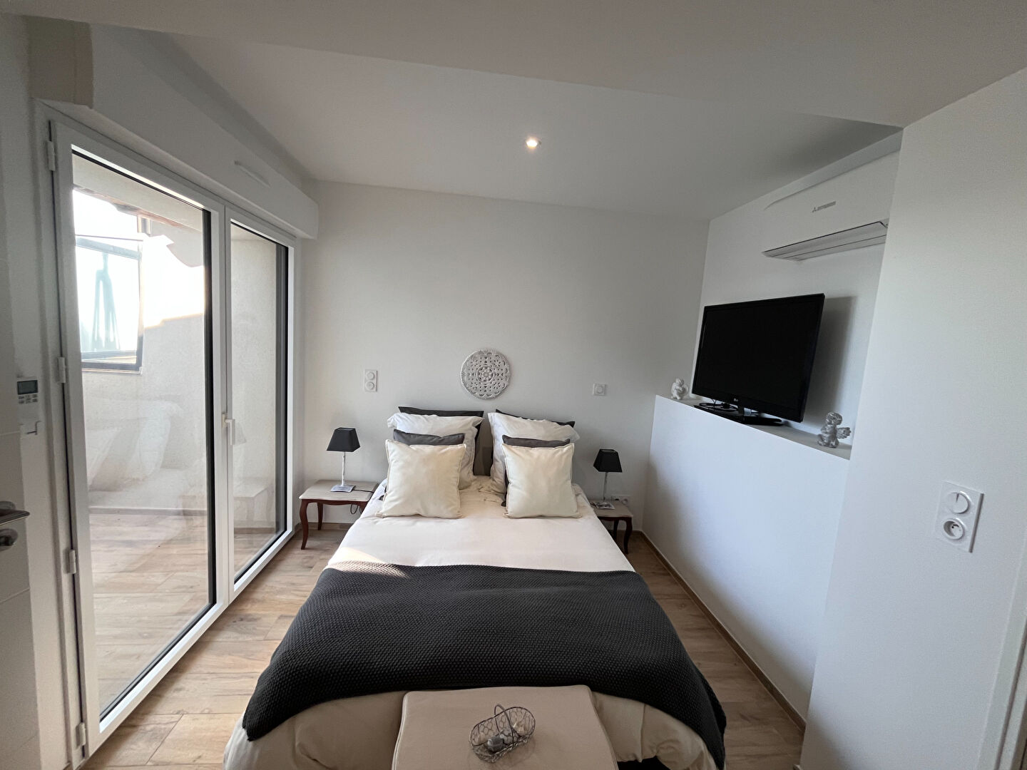 À l'étage, la première chambre, élégante et lumineuse, est agrémentée d'une salle d'eau moderne et offre un accès direct à la vue mer, créant un véritable havre de paix. La seconde chambre, idéale pour accueillir vos amis ou pour en faire la chambre d'un enfant, complète cet espace harmonieux.